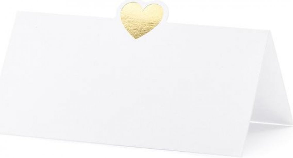 Svatební jmenovky z bílého papíru zdobené zlatým metalickým srdíčkem. Svatební jmenovky jsou vyrobené z papíru vysoké gramáže. Svatební jmenovky jsou opatřeny vytlačenou drážkou pro snadné ohnutí.