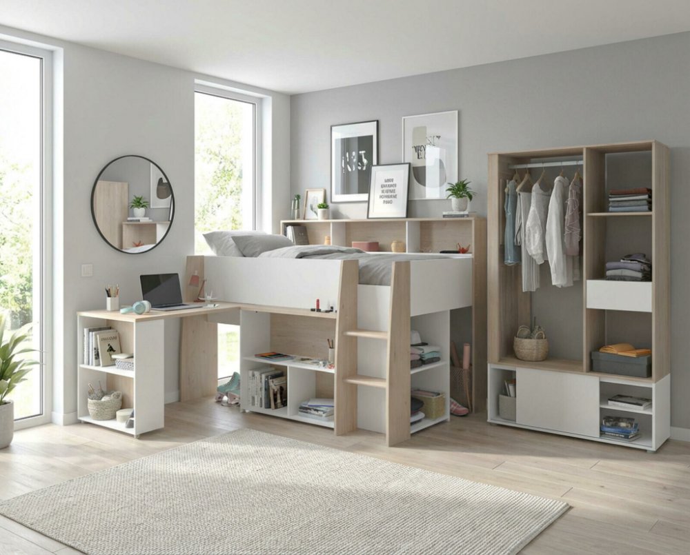Dětský pokoj na hraní i pro školáky. Návrh na vybavení rozměrově malého dětského pro holky i kluky, představujeme z nabídky francouzského výrobce, jehož produkty exkluzivně nabízíme na našich stránkách téměř dvě desetiletí. Kvalita ověřená časem, důmyslné designy, které optimálně řeší prostor, v kterém není místa nazbyt. A ruku na srdce, většina rodičů spíše disponuje menší místností pro vybavení interiéru dětí. Na Aldo nábytku se velmi rádi důmyslným designům věnujeme, milujeme unikátní návrhy, které šetří maximálně prostor nejen v dětském pokoji, ale i v místnostech určených nám dospělým.Dětský nábytek, který pamatuje na vše, třeba i na potřebu prostoru na hraní v dětském pokoji. Stačí zasunout pod lůžko psací stůl a dítě prostor navíc okamžitě získá. Ale tou největší úsporou místa je samozřejmě dětská postel multifunkční, která nabízí rafinovaně skryté úložné prostory. To je hlavní výhoda vyvýšeného lůžka, že v prostoru pod lůžkem vzniká dostatek místa pro umístění dalšího nábytku a hlavně úložných prostorů, které nezabírají zbytečně místo v dětském pokoji. K dětské posteli jsme do našeho návrhu přidali také otevřenou šatní skříň, která je školáků a školaček velmi oblíbeným řešením.K dispozici jsou vám, ale i další díly dětského nábytku v identickém designu a odstínech, jako třeba velmi praktický regál z kolekce Shoesing, který pro tento návrh velmi doporučujeme, především pro děti školou povinné. Ideální pro školní pomůcky a knížky. Regál není v ceně návrhu, ale určitě je vám v naší nabídce k dispozici. Stejně tak dětskou postel i otevřenou šatní skříň můžete pořídit jako samostatné díly nábytku. Materiálem pro výrobu se stala laminátová deska, doručení naší vlastní dopravou bez poškození.Dětský pokoj v sestavě, základní parametryv ceně sestavy dětská postel, rošt, psací stůl, otevřená šatní skříňrozměr místa na spaní pro matraci 90x200 cm, nosnost 90 kgdoporučujeme matraci s výškou max. 15 cmdetailní rozměry nábytku uvedeny na fotografiíchmožnost pořízení dětsk