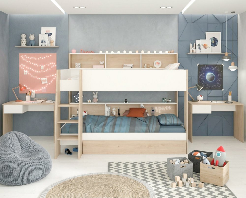 Patrová postel s šuplíkem si žádá i psací stoly pro dvě děti. Můžeme s jistotou říci, že patrová postel patří k nejčastějšímu řešení místa na spaní pro dvě děti a to již téměř dvě desetiletí, co se prodeji nábytku věnujeme. Ale dětský pokoj pro dvě děti, to přeci není jen patrová postel, ale i řada dalších, potřebných typů nábytku. Psací stoly mají v dětském pokoji rozhodně své místo, pokud jsou už vaše děti školou povinné. A pokud nejsou i tak myslete předem na jejich potřebu, aby vám po zařízení dětského pokoje zůstalo místo právě na psací stoly. A jak vznikal návrh dětského pokoje Shelter, který vám představujeme právě teď? Do pokoje jsme zakomponovali menší psací stoly s ohledem na skutečnost, že do dětského pokoje je třeba umístit hned dva pro dvě děti. I dva menší stoly jsou lepší, nežli jeden, o který by se děti měly dělit. Věříme, že náš návrh a vlastní uspořádání nábytku vás alespoň inspiruje, jak elegantně a účelově lze zařídit dětský pokoj s patrovou postelí.Kolekce dětského nábytku Shelter, kterou vám exkluzivně představujeme pouze na našich stránkách, nabízí i další dostupné díly nábytku, ale i další návrhy, jak příjemně může vypadat dětský pokoj i u vás doma. Patrovou postel v naší nabídce najdete rovněž samostatně, stejně jako i další díly z kolekce Shelter. Materiál laminátu s tloušťkou až 22 mm, kvalitní zpracování francouzského výrobce nábytku s certifikací. Celý dětský pokojíček vám doručíme naší vlastní dopravou bez poškození včetně výnosu zdarma.Dětský pokoj pro dvě děti, to není jen místo na spanív ceně sestavy pořídíte patrovou postel s šuplíkem, rošty a dva psací stolyrošty v podobě větraných desek, nosnost jednoho lůžka 90 kgrozměr místa na spaní o velikosti 90x200 cmvýška patrové postele 165 cm, hloubka 132 cm i se schůdky, délka 208 cmvýška šuplíku 22 cm, hloubka 42,4 cm, délka 163 cmšuplík jako úl. prostor, nelze využívat jako přistýlkyprostor mezi lůžky 68 cm, odkládací police podél obou lůžeknosnost jednoho schůdku 90 kg, široká nášlapn