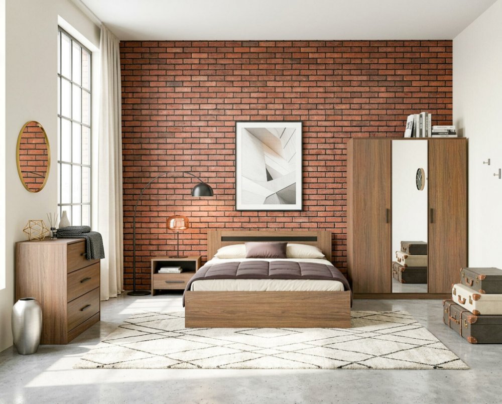 Sestava ložnice Azuka - netradiční odstín pálené dřevo. Stylová ložnicová sestava Azuka v teplém dubovém dekoru. V sestavě získáte postel 140 x 190 cm, třídveřovou šatní skříň se zrcadlem, komodu se zásuvkami a noční stolek. Moderní design, dostatečná úložná kapacita a velké zrcadlo v jednom – ideální do ložnice 12–18 m².Sestava ložnice Azuka 140 cm - parametryVelké zrcadlo na celé dveře šatní skříně (výška cca 185 cm) - opticky zvětší ložnici a ušetříte za samostatné zrcadloDveře v počtu tří křídel u skříně pro maximální přístup k vnitřnímu prostoruTeplý dubový dekor, který se hodí do moderních i industriálních ložnicKvalitní laminovaná dřevotříska – odolná proti poškrábání a snadno udržovatelná s tloušťkou od 15 až do 22 mmDostatek úložného prostoru pro 1–2 osoby (šaty, svetry, prádlo, boty)Snadná montáž a vysoká stabilita všech kusů (návod k montáži uvedeny v PDF v parametrech)Nábytek do ložnice Azuka - rozměryPostel pro matraci 140x190 cm - výška 71,5 cm, šíře 147,2 cm, délka 193,6 cm, ložná nosnost 140 kg v ceně s kvalitním roštemNoční stolek s šuplíkem - výška 34,5 cm, šíře 44 cm, hloubka 33,3 cmKomoda s šuplíky - výška 98 cm, šíře 80 cm, hloubky 44 cmŠatní skříň se zrcadlem - výška 196,7 cm, šíře 139 cm, hloubka 52 cmMatrace - doporučujeme matraci výšky minimálně 15 cm a výše, na rozdíl od roštu není v ceně sestavy ložniceSestava ložnice Azuka s dopravou i výnosem zdarmaProdej nábytku pro nás znamená i šetrné doručení bez poškození našimi vozy a to každého kousku, který si u nás vyberete. Navíc pro naše zákazníky, doručení i s výnosem do patra zdarma. Objevte i vy kouzlo komfortního nákupu na čas a bez starostí, ty nechte na nás.