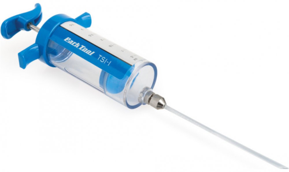 Park Tool plnička TSI-1 určená pro vpravení tmelu do bezdušových systémů. Průměr 45 mm, délka 110 mm + 120mm hadička vnějšího průměru 3,5 mm (pokud neprojde ventilkem, je nezbytné sejmout část pláště z ráfku). Určena pro maximální objem 100 ml.