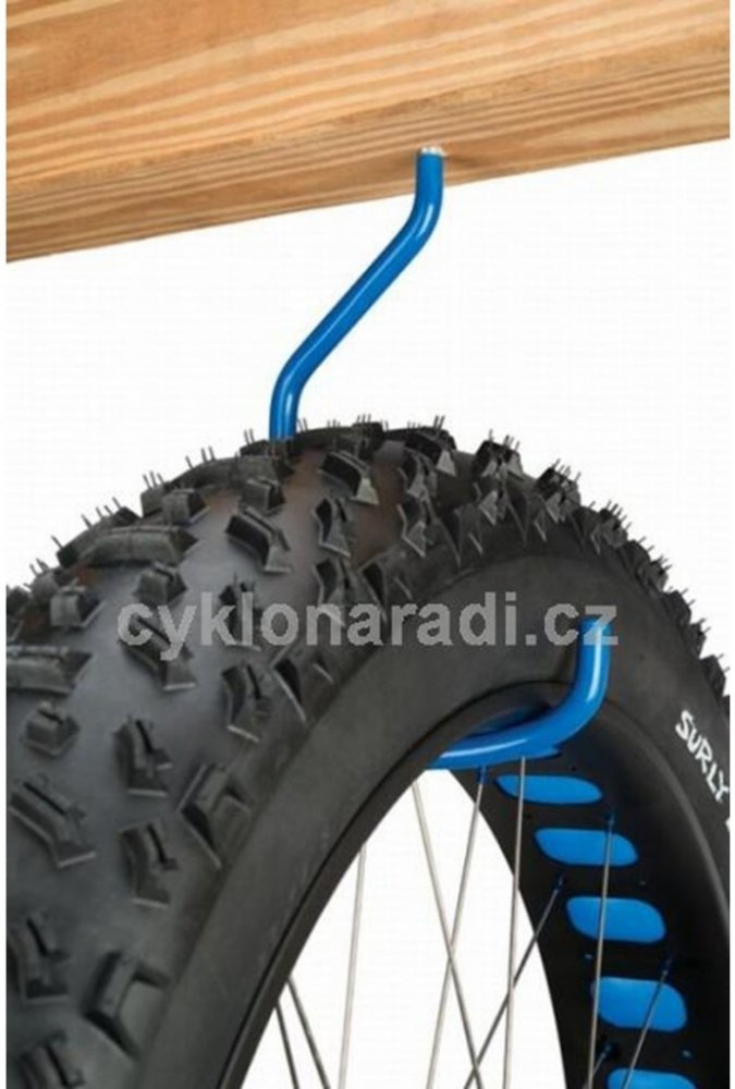 Hák se závitem M10 a maticemi pro zavěšení kol Fatbike. Kompatibilní s ráfky o šířce 100 mm a pláštěm 5,0 palců (vnitřní šířka 125 mm a výška cca 145 mm). Drát je pozinkovaný a potažený vinylovým plastem. Závit M10, délka závitu 50 mm.