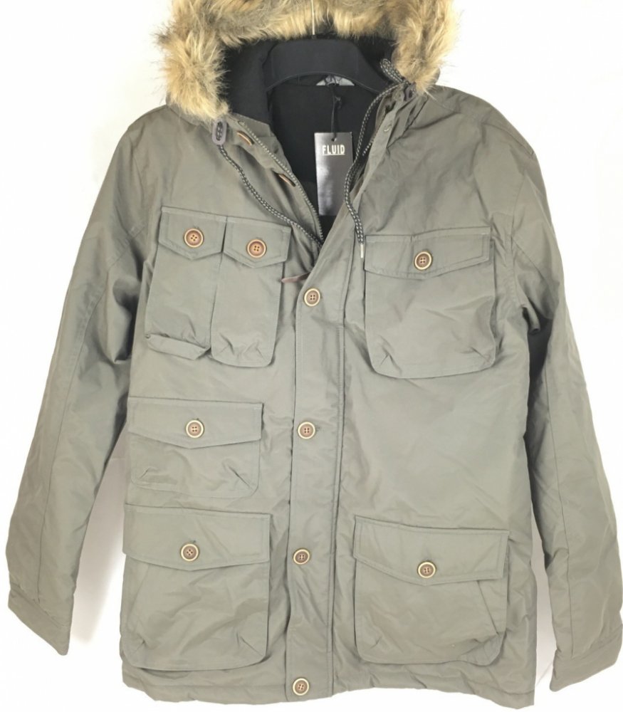 Stylová a praktická parka v decentním khaki zpracování od Fluid. Vyrobena z nylonu a polyesteru. Má praktickou kapuci, zapínání na zip a mnoho kapes.