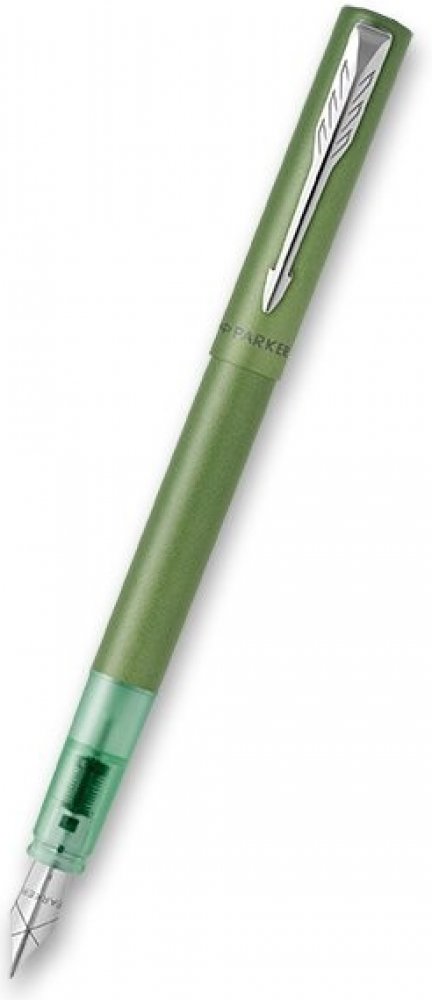 Plnicí pero Parker Vector XL – Green kombinuje saténový metalický lak v sytě zeleném odstínu s mosazným tělem a chromovanými doplňky. Transparentní úchopová část podtrhuje moderní vzhled a pohodlí při psaní.