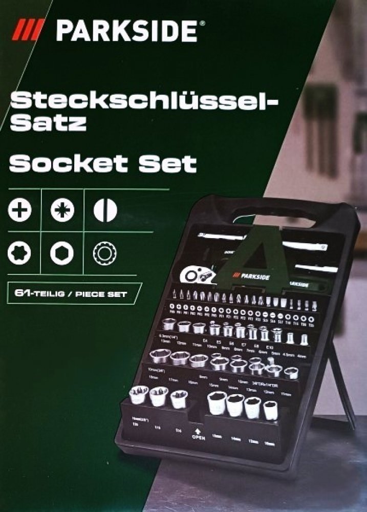 Parkside® Gola sada Psss 61 D4, 61dílná Kvalitní zpracování z chrom-vanadiové oceli (Cr-V) a oceli S2 Praktický úložný bos s rukojetí pro přenášení obsahuje: 3x bit s profilem E 10 mm (3/8") 11x bit 10 mm (3/8") 11x bit 6,3 mm (1/4") 1x ráčna 10 mm (3/8") – 72 zubů 1x rukojeť šroubováku 6,3 mm (1/4") – lze použít i jako prodloužení 2x prodloužení (75 mm) po 10 mm (3/8") a 6,3 mm (1/4") 1x bitový adaptér 6,3mm (1/4") 20x bit (25 mm) 6x profil E 6,3 mm (1/4") 1x adaptér z 10 mm (3/8") na 6,3 mm (1/4") 4x zápustný bit 10 mm (3/8") – velikosti: 10-12-14-15 mm 61dílná sada Prodloužení: 6,3 mm (1/4") Nastavení 1: pracovní úhel do 10° a maximálně 50 Nm Nastavení 2: pevné držení ořechu, maximálně 62 Nm Prodloužení: 10 mm (3/8") Nastavení 1: pracovní úhel do 10° a maximálně 162 Nm Nastavení 2: pevné držení ořechu, maximálně 202 Nm Rozměry cca 352 x 217 x 42 mm Hmotnost Box: cca 550 g
