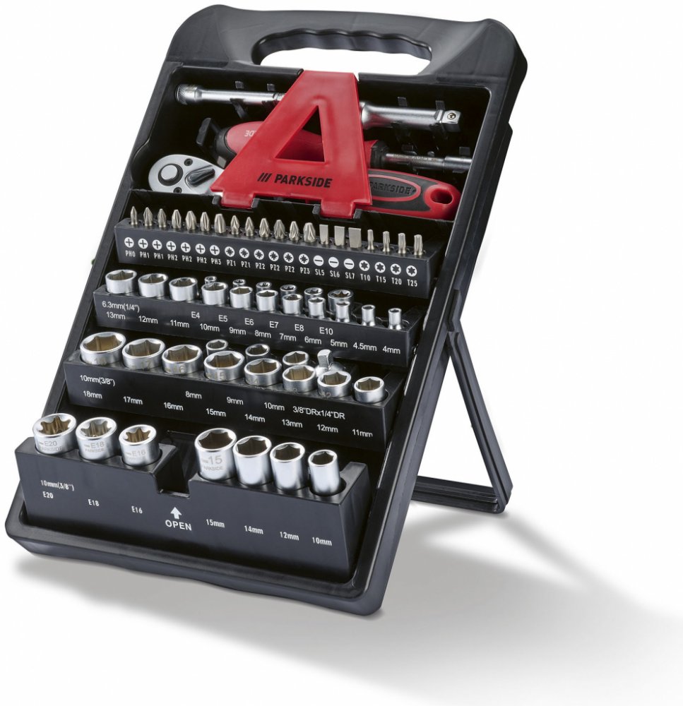 Parkside® Gola sada Psss 61 D4, 61dílná Kvalitní zpracování z chrom-vanadiové oceli (Cr-V) a oceli S2 Praktický úložný bos s rukojetí pro přenášení obsahuje: 3x bit s profilem E 10 mm (3/8") 11x bit 10 mm (3/8") 11x bit 6,3 mm (1/4") 1x ráčna 10 mm (3/8") – 72 zubů 1x rukojeť šroubováku 6,3 mm (1/4") – lze použít i jako prodloužení 2x prodloužení (75 mm) po 10 mm (3/8") a 6,3 mm (1/4") 1x bitový a...