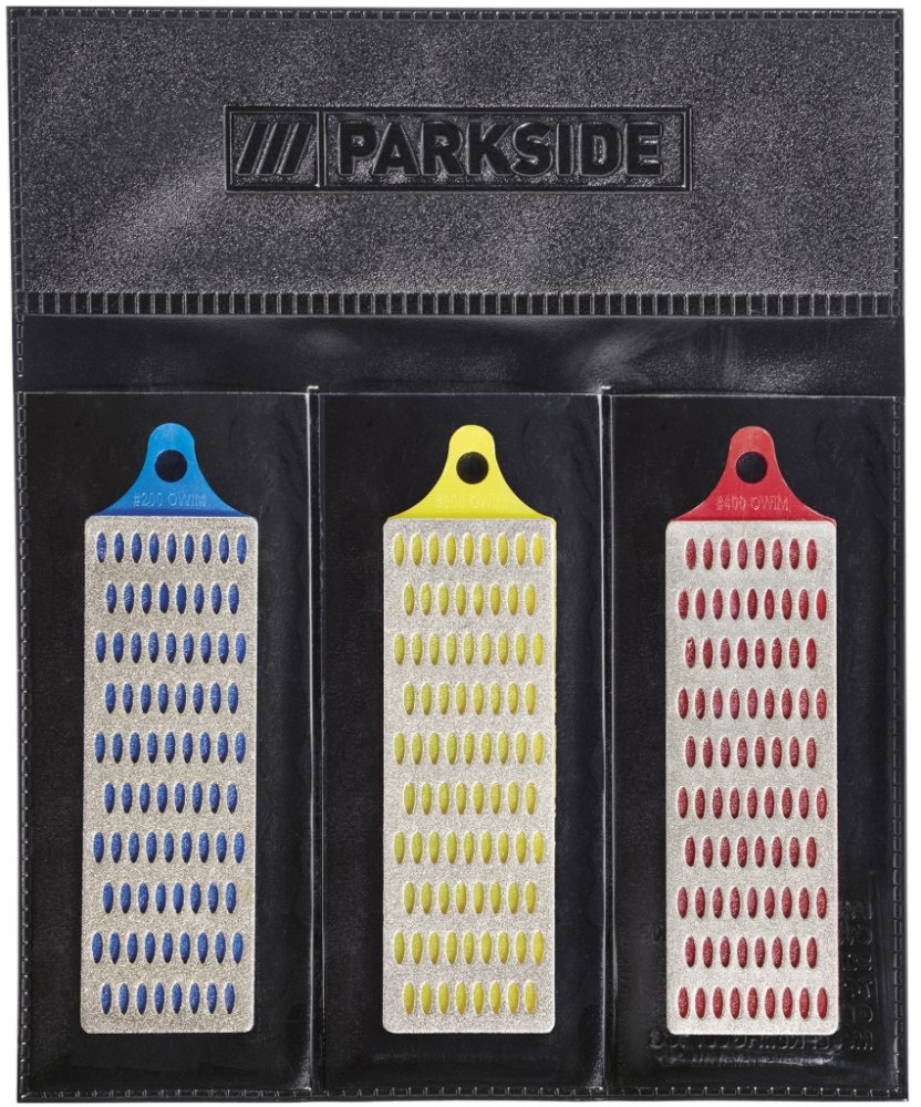 PARKSIDE® Diamantový brousek / Brusná deska Diamantový brousek, červený Kulatý profil na ostření nožů, plochý profil na ostření hran skla nebo dlaždiček Drážka na ostření rybářských háčků a šipek na házení Výsuvný brusný nástroj Praktický tyčový držák se šroubovým upevněním a klipsem na kapsu Diamantový brousek, modrý Na broušení sekáčů, vroubkovaných nebo zahnutých ostří Praktický tyčový držák se šroubovým upevněním a klipsem na kapsu Diamantová brusná deska, 3dílná sada Na broušení všech druhů řezných nástrojů, jako jsou nože, sekáče nebo nůžky Desku není nutné mazat olejem, stačí čistá voda Pouzdro na uložení Stupeň zrnitosti: modrá 200 (hrubá), žlutá 300 (střední), červená 400 (jemná) Obsah balení Diamantová brusná deska, 3dílná sada: karbonová ocel s diamantovou vrstvou a plastovou spodní deskou Diamantový brousek, modrý; červený: rukojeť: hliník čepel: karbonová ocel s diamantovou vrstvou Rozměry Diamantová brusná deska, 3dílná sada: cca 2,5 x 7,6 cm (Š x V) Diamantový brousek, modrý; červený: cca 19,5 cm