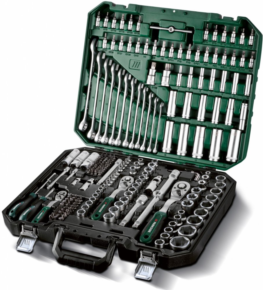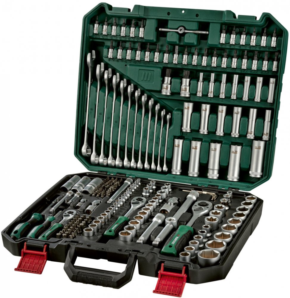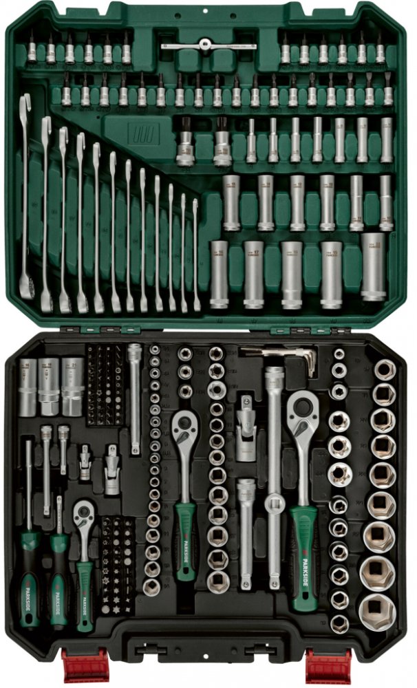 Z chrom-vanadiové, chrom-molybdenové oceli a oceli S2 V matném provedení – dobře rozeznatelné velikosti díky laserovému označení Přehledně roztříděné nářadí v praktickém a pevném kufříku 216dílná sada 39x šestihranné nástrčné díly 18x šestihranné prodloužené nástrčné díly 14x nástrčné díly v profilu E 3x ráčny s funkcí rychlého povolování 3x nástrčné klíče na svíčky 4x prodloužení 1x wobble prodloužení s adaptérem 1x rukojeť ve tvaru T 3x kardanové klouby 12x otevřené a prstýnkové klíče 1x rukojeť šroubováku – použitelná i jako prodloužení 1x rukojeť šroubováku s magnetickým držením bitů 74x bity 32x bitové nástavce 3x bitové adaptéry 7x inbusové klíče Rozměry Kufřík: cca 445 x 370 x 90 mm (D x Š x V) Hmotnost cca 10,9 kg