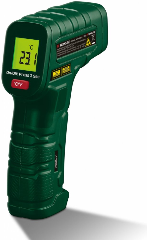 Parkside® Infračervený teploměr Pbhitm A1 / Měřič vlhkosti Pbhitm A1 Infračervený teploměr Pbhitm A1 Na rychlé měření teploty povrchů Ideální k vyhledání tepelných mostů a míst ohrožených plísní Zaměřovací laser pro přesný výběr měřicího bodu Přesný infračervený měřicí signál Digitální zobrazení naměřené hodnoty Ukazatel výměny baterií a automatické vypnutí (cca 60 sekund) Včetně baterií (2x 1,5 V...
