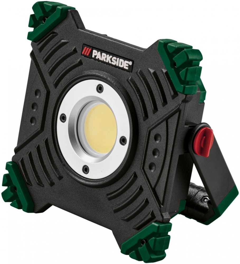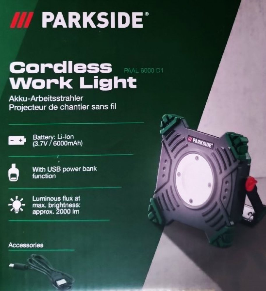 Parkside® Aku pracovní LED reflektor Paal 6000 D1 Výkonná 20W Cob-Led 4 režimy provozu: max. jas / 50% úsporný režim / SOS signál / červené blikání 2 USB připojení a 1 ukazatel stavu nabití akumulátoru s ochranným výklopným krytem Nárazuvzdorné tělo s pogumovanými hranami – chráněno proti stříkající vodě (Ip65) Výklopný magnetický podstavec pro bezpečné držení Vhodný také k zavěšení Včetně návodu Doba svícení v režimu reflektoru: cca 2 h (max. jas) / cca 4 h (50 % úsporný režim) Doba svícení v režimu blikání: cca 8 h (Sos signál) / cca 60 h (červené blikání) Teplota světla (kromě červeného blikání): cca 6 500 K (bílé denní světlo) Dodané příslušenství: 1 USB kabel (typ C) Výstupní výkon Usb: 5 V, 2,1 A Vstupní výkon USB (typ C): 5 V, 2,0 A Technické údaje Akumulátor: Li-Ion (3,7 V / 6 000 mAh) Světelný tok při max. jasu: cca 2 000 lm Jmenovitá kapacita powerbanky: 3 500 mAh (při 5 V, 2,1 A) Rozměry cca 165 x 150 x 44 mm Hmotnost cca 700 g