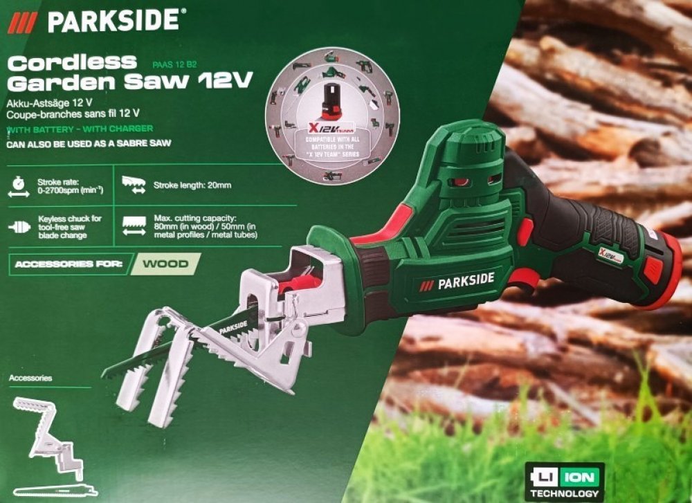 Parkside® Aku pilka na větve Paas 12 B2, 2 Ah Včetně akumulátoru a nabíječky Na výkonné řezání větví až do Ø 80 mm Ozubený držák větví – beznástrojově nasaditelný Lze používat také jako pilu ocasku Aretace proti náhodnému zapnutí Rychloupínací sklíčidlo pro výměnu pilového listu bez použití nářadí Včetně kvalitního 152mm HCS pilového listu na dřevo Kompatibilní s běžnými pilovými listy pro pily ocasky – vhodná také na stavební dřevo a plast (např. sada pilových listů Parkside Pfsz 3 B1 / Paasz 3 A1) Ergonomický tvar rukojeti s protiskluzovým měkkým povrchem 3stupňový ukazatel stavu nabití akumulátoru Včetně praktického kufříku na uložení Dodané příslušenství: 1x pilový list na dřevo (Hcs 152 mm) 1x držák větví Kompatibilní se všemi akumulátory série „X 12 V Team“ Obsah balení: 1x aku pilka na větve Paas 12 B2 1x akumulátor Papk 12 2 Ah 1x nabíječka 2,4 A Technické údaje Počet zdvihů: 0–2 700 min⁻¹ Výška zdvihu: 20 mm Upnutí pilového listu: 12,7 mm (½″) Max. řezný výkon: 80 mm (do dřeva) / 50 mm (do kovových profilů / kovových trubek) Rozměry Pila s akumulátorem; bez držáku větví: cca 31,7 x 13,9 x 6,5 cm Pila bez akumulátoru; bez držáku větví: cca 28,5 x 13,6 x 6,5 cm Držák větví: cca 13 x 6,13 x 11,1 cm Nabíječka: cca 12 x 9,3 x 5,45 cm Hmotnost Pila s akumulátorem; bez držáku větví: cca 1,25 kg Držák větví: cca 186 g Pilový list: cca 13 g Nabíječka: cca 239 g