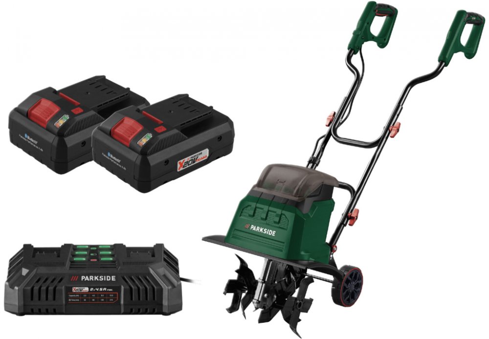 Parkside® Aku kultivátor Pabh B2, 2x Smart 4 Ah Parkside® Aku kultivátor Pabh B2 Vlastnosti Výkonný kultivátor pro pohodlné; bezkabelové kypření půdy Bezkartáčový motor Brushless Motor – mimořádně vysoká životnost díky nízkému opotřebení 4 speciálně tvrzené nožové hvězdice s tichým chodem Automatické pronikání do hrubé půdy se 4stupňovým nastavením pracovní hloubky Převodovka s dlouhou životností a s trvalým mazáním v olejové lázni Ergonomická držadla s protiskluzovým měkkým povrchem a bezpečnostním spínačem Robustní kryt z plastu odolného proti nárazu Praktická poloha transportních koleček a sklápěcí funkce pro úsporu místa Kompatibilní se všemi akumulátory série „X 20 V Team“ 1 akumulátorová série – více než 100 přístrojů Doporučené akumulátory: 2x 20 V 4,0 Ah Doporučená nabíječka: dvojitá rychlonabíječka 20 V 4,5 A Pro provoz jsou bezpodmínečně nutné 2 akumulátory Záruka: 3 roky Charakteristika produktu tabletd Provozní režim: akumulátor Pracovní šířka: cca 30 cm Max. pracovní hloubka: cca 20 cm Volnoběžné otáčky: 140 min -1 Ochrana proti přetížení: ano Kolečka: ano Výškově nastavitelná kolečka: ano Materiál: plast; ocel Rozměry: cca 138 x 42 x 93,8 cm Hmotnost: cca 9,7 kg Parkside Performance® Smart akumulátor 4 Ah Paps 204 B1 Vlastnosti Li-Ion akumulátor v nové; výkonné dimenzi díky chytré technologii akumulátoru a použití článků 21700 Data akumulátoru lze vyvolat a výkonnostní parametry lze konfigurovat přes Bluetooth® prostřednictvím aplikace Parkside: Nastavitelné režimy: Performance výkon; Balanced vyvážený; Eco a Expert Monitorování akumulátoru – vyvolání dat o stavu nabíjení; zbývajícím čase, době nabíjení; celkové době použití atd. Cell Balancing – delší doba provozu akumulátoru; zvýšená životnost akumulátoru: Delší doba provozu a životnost akumulátoru díky rovnoměrně namáhaným článkům Maximální využití potenciálu nabití Ideální v kombinaci se smart nabíječkou akumulátoru Parkside 20 V / 12 A Plgs 2012 A1 V porovnání s akumulátorem Parkside 20 V / 2 Ah PAP 20 B1: O 100 % delší doba provozu při stejné velikosti akumulátoru rozměry O 70 % vyšší vybíjecí proudy pro větší výkon Kompatibilní se všemi nářadími série Parkside X 20 V Team Záruka: 3 roky Charakteristika produktu tabletd Typ akumulátor Jmenovité napětí 20 V Kapacita 4 Ah Ukazatel stavu nabití 3stupňový Monitorování akumulátoru pomocí aplikace Parkside Materiál plast Rozměry cca 12,3 x 5,25 x 8,4 cm Hmotnost cca 601 g Parkside® Dvojitá rychlonabíječka Pdslg 20 B1 Vlastnosti Současné nabíjení 2 akumulátorů – také s různou kapacitou Automatické vypínání nabíjení a 3stupňový ukazatel stavu nabití akumulátoru Protiskluzové gumové nopky Vhodná pro montáž na stěnu montážní materiál není součástí balení Kompatibilní se všemi akumulátory řady Parkside X 20 V Team Záruka: 3 roky Charakteristika produktu tabletd Jmenovitý příkon: 220 W Max. nabíjecí proud: 2x 4,5 A Doba nabíjení: 2 Ah / 4 Ah / 8 Ah / 12 Ah: 35 min / 60 min / 120 min / 210 min Délka síťového kabelu: cca 2 m Materiál: plast Rozměry: cca 25 x 14,5 x 8,7 cm D x Š x V Hmotnost: cca 940 g