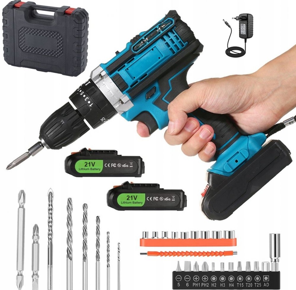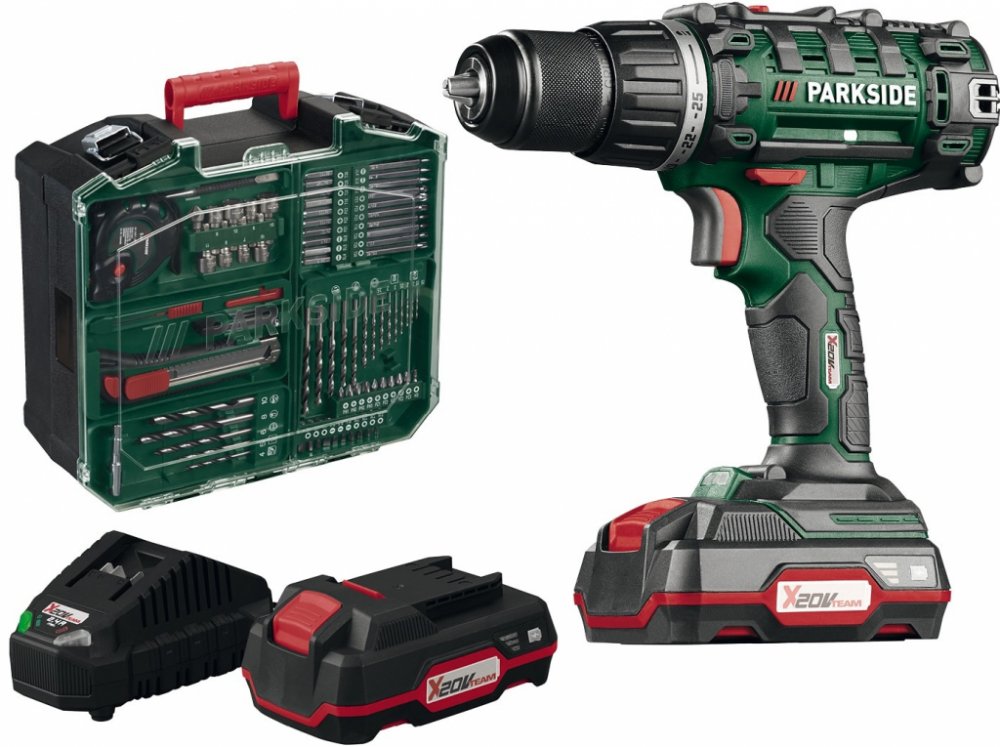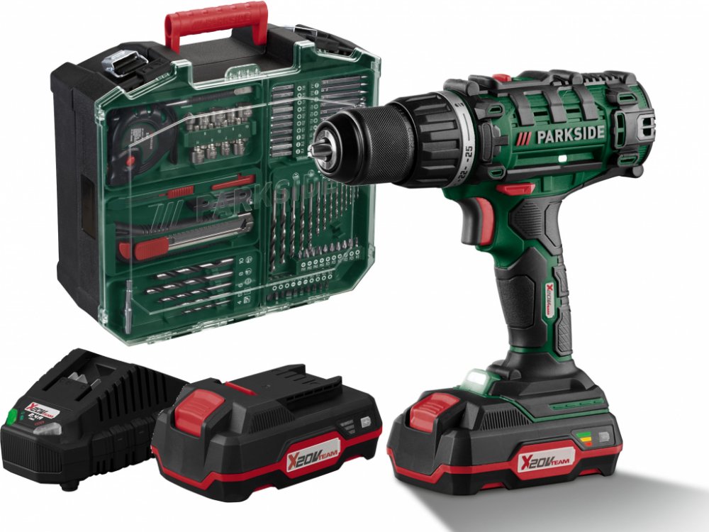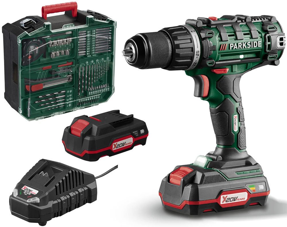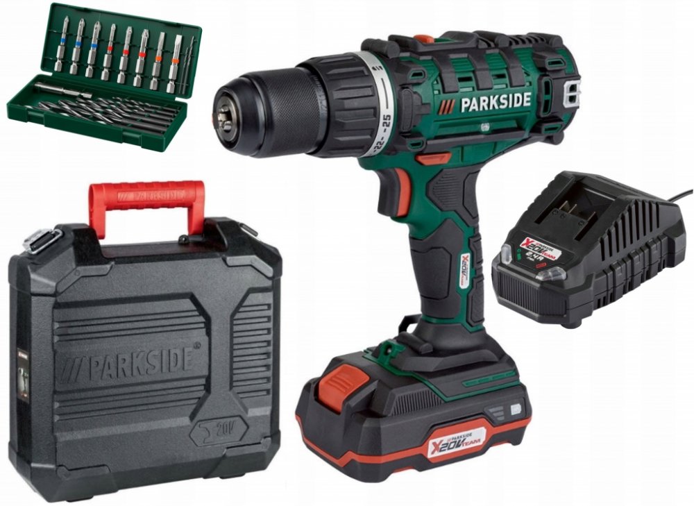 - Příslušenství: 1 akumulátor (20 V / 2 Ah), 1 nabíječka (20 V / 2,4 A), 8 vrtáků do kovu HSS (2/2,5/3/4/5/6/8/10 mm), 8 bitů (délka 50 mm: PH1/PH2/PH3/PZ1/PZ2/PZ3/SL5/SL6), 1 držák bitů (délka 60 mm)