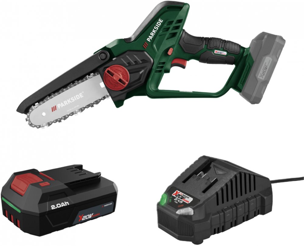 Parkside® Aku řetězová pila Paghs 20-Li C4, 2 Ah Parkside® Aku řetězová pila Paghs 20-Li C4 Vlastnosti Slouží k prořezávání stromů, keřů a kácení malých stromků Mimořádně kompaktní s nízkou vlastní hmotností – pro pohodlné a rychlé řezání Funkce rychlé beznástrojové výměny řetězu Tichý řetěz s nízkými vibracemi Protiskluzové držadlo s bezpečnostním spínačem Ideální také na řezání prken, hranolů a kulatiny nebo pro kutily Hladina akustického tlaku: cca 77 dBA V praktickém kufříku na uložení Pro optimální výkon doporučujeme použít akumulátor: 20 V 2 Ah – k provozu je zapotřebí 1 akumulátor Kompatibilní se všemi akumulátory série Parkside X 20 V Team Záruka: 3 roky Charakteristika produktu tabletd Provozní režim: akumulátor Rychlost řetězu: 8 m/s Profil řetězu: nízký profil Počet hnacích článků: 31 Délka lišty: cca 17,7 cm Max. délka řezu: cca 15 cm Příslušenství: 1x ochranný kryt řetězu 50 ml BIO řetězového oleje „Made in Germany“ 1x náhradní řetěz Kufřík na uložení: ano Materiál: plast; ocel Rozměry: cca 40,7 x 8,6 x 20,2 cm D x Š x V Hmotnost: cca 1,4 kg Parkside® Akumulátor 2 Ah PAP 202 A1 Vlastnosti Výkonný Li-Ion akumulátor s 3stupňovým ukazatelem stavu nabití Cell Balancing – delší doba provozu akumulátoru; zvýšená životnost akumulátoru Vyšší výkon akumulátoru díky rovnoměrně namáhaným článkům Maximální nabíjecí potenciál Kompatibilní se všemi přístroji série Parkside X 20 V Team Záruka: 3 roky Charakteristika produktu tabletd Typ: Li-Ion akumulátor Jmenovité napětí: 20 V Kapacita: 2 Ah Ukazatel stavu nabití: ano Materiál: plast Rozměry: cca 12,2 x 5,3 x 8,4 cm D x Š x V Hmotnost: cca 415 g Parkside® Nabíječka PLG 20 C1 Vlastnosti Automatické vypnutí nabíjení a LED ukazatel nabití Spodní strana s protiskluzovými nopky Integrovaný držák na stěnu montážní materiál není součástí balení Kompatibilní se všemi akumulátory série Parkside X 20 V Team Záruka: 3 roky Charakteristika produktu tabletd Jmenovitý příkon: 65 W Nabíjecí proud: 2,4 A Doba nabíjení: 2 Ah / 4 Ah / 8 Ah 60 min / 120 min / 240 min Délka síťového kabelu: cca 2 m Materiál: plast Rozměry: cca 13,78 x 9,2 x 6,54 cm D x Š x V Hmotnost: cca 325 g