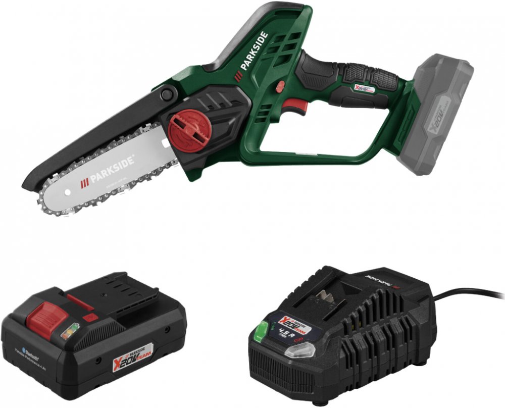 Parkside® Aku řetězová pila Paghs 20-Li C4, Smart 4 Ah Parkside® Aku řetězová pila Paghs 20-Li C4 Vlastnosti Slouží k prořezávání stromů, keřů a kácení malých stromků Mimořádně kompaktní s nízkou vlastní hmotností – pro pohodlné a rychlé řezání Funkce rychlé beznástrojové výměny řetězu Tichý řetěz s nízkými vibracemi Protiskluzové držadlo s bezpečnostním spínačem Ideální také na řezání prken, hran...