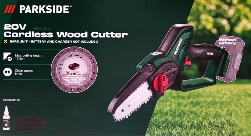 Parkside® Aku řetězová pila Paghs C3, 2 Ah Parkside® Aku řetězová pila Paghs C3 Vlastnosti K prořezávání stromů a keřů a kácení malých stromků Mimořádně kompaktní s nízkou vlastní hmotností – pro pohodlné a rychlé řezání Funkce rychlé beznástrojové výměny řetězu Tichý řetěz s nízkými vibracemi Protiskluzové držadlo s bezpečnostním spínačem Ideální také pro řezání prken, hranolů a kulatiny nebo pro řemeslné práce V praktickém úložném kufříku Pro optimální výkon doporučujeme použití akumulátoru 20 V 2 Ah – pro provoz je potřeba 1 akumulátor Kompatibilní se všemi akumulátory série „X 20 V Team“ Záruka: 3 roky Charakteristika produktu tabletd Způsob provozu: akumulátor Napětí akumulátoru: 20 V Rychlost řetězu: 8 m/s Profil řetězu: nízkoprofilový Rozteč řetězu: ″P Šířka drážky: mm Počet hnacích článků: 31 Délka lišty: 17;7 cm Délka řezu: cca 15 cm Max. tloušťka větve: - Délka zdvihu: - Příslušenství: 1x ochranný kryt řetězu, 50 ml bio řetězového oleje, 1x náhradní řetěz Úložný kufřík: ano Materiál: plast; ocel Rozměry: cca 40,7 x 8,6 x 20,2 cm D x Š x V Hmotnost: cca 1,28 kg Parkside® Akumulátor 2 Ah PAP 20 B1 Vlastnosti Výkonný Li-Ion akumulátor s 3stupňovým ukazatelem stavu nabití Cell Balancing – delší doba provozu akumulátoru; zvýšená životnost akumulátoru Vyšší výkon akumulátoru díky rovnoměrně namáhaným článkům Maximální nabíjecí potenciál Kompatibilní se všemi zařízeními série „X 20 V Team“ Záruka: 3 roky Charakteristika produktu tabletd Typ Li-Ion Jmenovité napětí max. 20 V Kapacita 2 Ah Ukazatel stavu nabití 3stupňový Monitorování akumulátoru - Materiál TPE Rozměry cca 12,7 x 5,2 x 8,4 cm D x Š x V Hmotnost cca 440 g Parkside® Nabíječka PLG 20 C1 Automatické vypínání a LED ukazatel stavu nabití Protiskluzové gumové nopky Včetně zařízení pro upevnění na stěnu montážní materiál není součástí balení Kompatibilní s jakýmkoliv akumulátorem série „Parkside X 20 V Team“ Záruka: 3 roky Technické údaje Jmenovitý příkon: 65 W Nabíjecí proud: max. 2,4 A Doba nabíjení při 20 V: 2 Ah / 4 Ah / 8 Ah / 12 Ah: 60 min / 120 min / 240 min / 380 min Rozměry cca 13,8 x 9,1 x 6,9 cm Délka síťového kabelu: cca 2 m Hmotnost cca 326 g