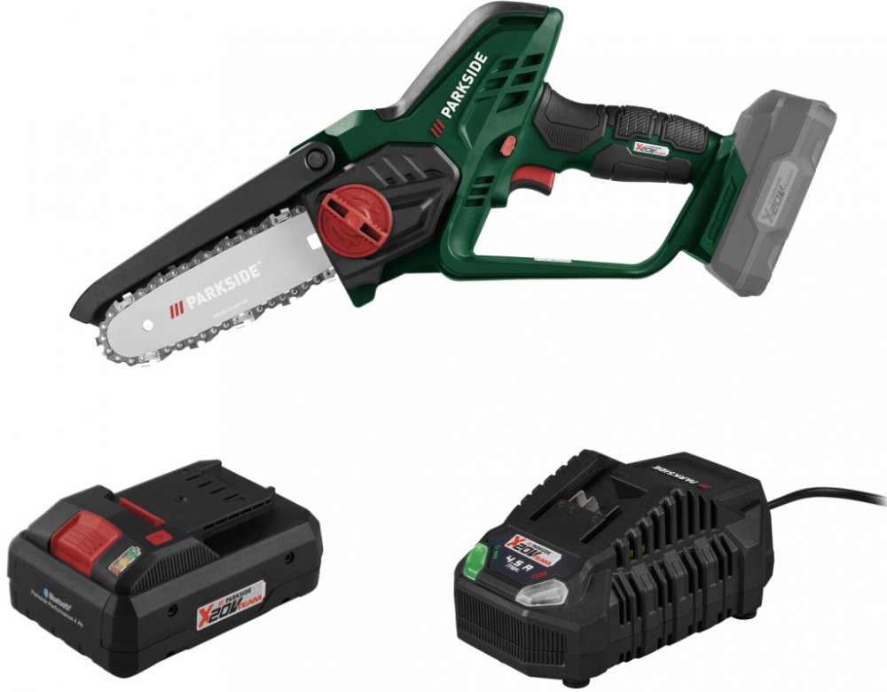 Parkside® Aku řetězová pila Paghs C3, Smart 4 Ah Parkside® Aku řetězová pila Paghs C3 Vlastnosti K prořezávání stromů a keřů a kácení malých stromků Mimořádně kompaktní s nízkou vlastní hmotností – pro pohodlné a rychlé řezání Funkce rychlé beznástrojové výměny řetězu Tichý řetěz s nízkými vibracemi Protiskluzové držadlo s bezpečnostním spínačem Ideální také pro řezání prken, hranolů a kulatiny nebo pro řemeslné práce V praktickém úložném kufříku Pro optimální výkon doporučujeme použití akumulátoru 20 V (2 Ah) – pro provoz je potřeba 1 akumulátor Kompatibilní se všemi akumulátory série „X 20 V Team“ Záruka: 3 roky Charakteristika produktu ;} Způsob provozu: akumulátor Napětí akumulátoru: 20 V Rychlost řetězu: 8 m/s Profil řetězu: nízkoprofilový Rozteč řetězu: 0;3″P Šířka drážky: 1;1 mm Počet hnacích článků: 31 Délka lišty: 17;7 cm Délka řezu: cca 15 cm Max. tloušťka větve: - Délka zdvihu: - Příslušenství: 1x ochranný kryt řetězu, 50 ml bio řetězového oleje, 1x náhradní řetěz Úložný kufřík: ano Materiál: plast; ocel Rozměry: cca 40,7 x 8,6 x 20,2 cm (D x Š x V) Hmotnost: cca 1,28 kg Parkside Performance® Smart akumulátor 4 Ah Paps 204 B1 Vlastnosti Li-Ion akumulátor v nové; výkonné dimenzi díky inteligentní technologii akumulátoru a použití článků 21 700 Data akumulátoru lze vyvolat a výkonnostní parametry lze konfigurovat přes Bluetooth® prostřednictvím aplikace Parkside Nastavitelné režimy: Performance (výkon); Balanced (vyvážený); Eco a Expert Monitorování akumulátoru – vyvolání dat o stavu nabíjení; zbývajícím čase, době nabíjení; celkové době použití apod. Cell Balancing – delší doba provozu akumulátoru; zvýšená životnost akumulátoru Delší doba provozu a životnost akumulátoru díky rovnoměrně namáhaným článkům Maximální využití potenciálu nabití Záruka: 3 roky Charakteristika produktu ;} Typ: Li-Ion Jmenovité napětí: 20 V Kapacita: cca 4 Ah Ukazatel stavu nabití: 3stupňový Monitorování akumulátoru: prostřednictvím aplikace Parkside Materiál: TPE Rozměry: cca 12,3 x 5,25 x 8,4 cm (D x Š x V) Hmotnost: cca 601 g Parkside® Rychlonabíječka PLG 20 C3 Vlastnosti Kompatibilní se všemi akumulátory řady Parkside X 20 V Team Automatické vypnutí nabíjení a LED ukazatel nabití Spodní strana s protiskluzovými nopky Integrovaný nástěnný držák Záruka: 3 roky Charakteristika produktu table{width:100%;}td{padding-right: 30px; padding: 0.5rem; border-bottom: 0.0625rem solid #e3e4e5;} tr:nth-child(odd) {background-color: #F2F2F3;} Jmenovitý příkon 120 W Nabíjecí proud max. 4,5 A Doba nabíjení při 20 V / 2 Ah: 35 minut při 20 V / 4 Ah: 60 minut při 20 V / 8 Ah: 120 minut při 20 V / 12 Ah: 180 minut Délka síťového kabelu cca 1,5 m Materiál plast Rozměry cca 15,0 x 9,2 x 7,1 cm Hmotnost cca 395 g
