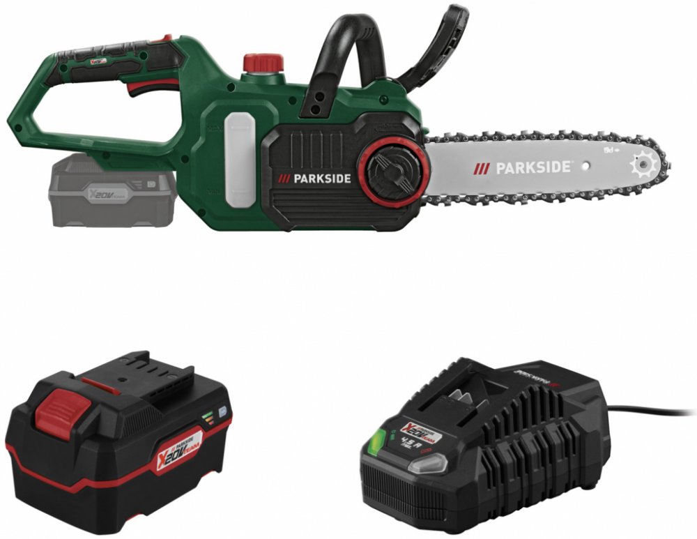 Parkside® Aku řetězová pila Paks 20-Li E5, 4 Ah Parkside® Aku řetězová pila Paks 20-Li E5 Kompaktní; výkonná pila – ideální pro kácení a řezání až do cca 15 cm průměru Pohodlná práce díky pozvolnému rozběhu, brzdovému systému a okamžitému zastavení řetězu Rychlý postup řezání díky robustnímu pilovému řetězu s polovičním dlátem a roztečí 3/8″ Ergonomické držadlo s protiskluzovým měkkým povrchem a bezpečnostním spínačem Horní držadlo pro pohodlné řezání také v šikmém směru Brzda zpětného rázu „Anti-Kickback“ Beznástrojové napínání řetězu Automatický systém mazání řetězu Robustní drapákový doraz Kontrolní okénko stavu oleje a kryt nádržky na olej s pojistkou proti ztrátě Doporučený akumulátor: 20 V (4 Ah) Kompatibilní se všemi akumulátory série „X 20 V Team“ Dodané příslušenství: 1x ochranný kryt řetězu 180 ml bio řetězového oleje „Made in Germany“ Záruka: 3 roky Technické údaje Volnoběžné otáčky motoru: 26 000 min -1 Max. točivý moment motoru: 0,4 Nm Délka lišty: 12″ (cca 30,7 cm) Max. délka řezu: cca 23 cm Rychlost řetězu: max. 10 m/s Objem nádržky na olej: cca 270 ml Doba provozu: cca 20 min (2 Ah)/ cca 40 min (4 Ah) Rozměry cca 66,9 x 24,2 x 21,7 cm Hmotnost cca 3,3 kg ¨ Parkside® Akumulátor 4 Ah PAP 20 B3 Výkonný Li-Ion akumulátor se 3stupňovým ukazatelem stavu baterie Cell Balancing – delší doba provozu akumulátoru; zvýšená životnost akumulátoru Delší doba provozu a životnost akumulátoru díky rovnoměrně namáhaným článkům Maximální využití potenciálu nabití Kompatibilní se všemi nářadími série „Parkside X 20 V Team“ Záruka: 3 roky Technické údaje Typ: Li-Ion Napětí: 20 V Kapacita: 4 Ah Rozměry cca 12,7 x 7,1 x 8,4 cm Hmotnost cca 712 g Parkside® Rychlonabíječka PLG 20 C3 Automatické vypnutí nabíjení a LED ukazatel nabití akumulátoru Protiskluzové gumové nopky Včetně zařízení pro upevnění na stěnu (montážní materiál není součástí balení) Kompatibilní se všemi akumulátory série „X 20 V Team“ Záruka: 3 roky Technické údaje Jmenovitý příkon: 120 W Nabíjecí proud: 4,5 A Doba nabíjení 2 Ah / 4 Ah / 8 Ah: 30 min. (připraveno k použití) / 60 min. / 120 min. / 210 min. Rozměry cca 15 x 9,2 x 7,1 cm Délka síťového kabelu: cca 2 m Hmotnost cca 430 g