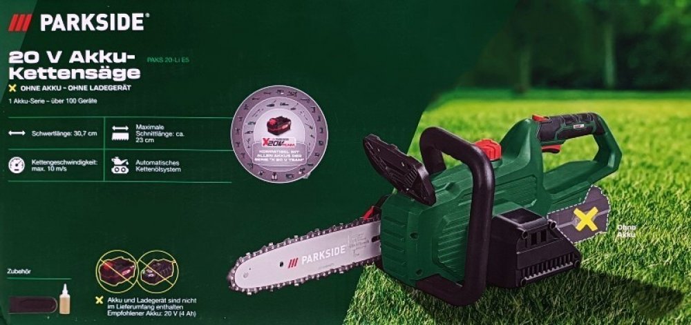 Parkside® Aku řetězová pila Paks 20-Li E5 – bez akumulátoru a nabíječky Vlastnosti Kompaktní; výkonná pila – ideální pro kácení a řezání do cca 15 cm průměru Pohodlná práce díky plynulému rozběhu, brzdovému systému a okamžitému zastavení řetězu Rychlý postup řezání díky robustnímu pilovému řetězu s polovičními dlátovými zuby a roztečí 3/8″ Ergonomické držadlo s protiskluzovým měkkým povrchem a bezpečnostním spínačem Horní držadlo pro pohodlné řezání také v šikmém směru Brzda zpětného rázu „Anti-Kickback“ Beznástrojové napínání řetězu Automatický systém mazání řetězu Kontrolní okénko hladiny oleje a víčko olejové nádržky zajištěné proti ztrátě Max. točivý moment motoru: 0,4 Nm Volnoběžné otáčky motoru: 26 000 min -1 Doba provozu: 2 Ah cca 20 min / 4 Ah cca 37 min Pro optimální výkon doporučujeme použití akumulátoru Parkside 20 V 4 Ah – pro provoz je potřebný 1 akumulátor Kompatibilní se všemi akumulátory série Parkside X 20 V Team Záruka: 3 roky Charakteristika produktu tabletd Způsob provozu akumulátor Výstupní výkon 450 W Rychlost řetězu max. 10 m/s Profil řetězu - Rozteč řetězu 3/8 ″ Šířka drážky mm Počet hnacích článků - Délka lišty cca 30,7 cm 12 ″ Délka řezu max. 23 cm Max. tloušťka větve cca 15 cm Délka zdvihu - Objem olejové nádržky 270 ml Příslušenství 1x ochranný kryt řetězu, 270 ml bio řetězového oleje „Made in Germany” Úložný kufr - Materiál ocel; plast Rozměry 1x aku řetězová pila bez akumulátoru; s lištou a řetězem: cca 66,9 x 24,2 x 21,7 cm Hmotnost cca 3,4 kg