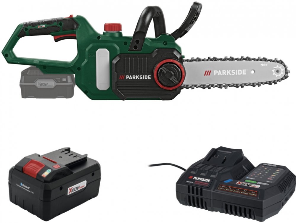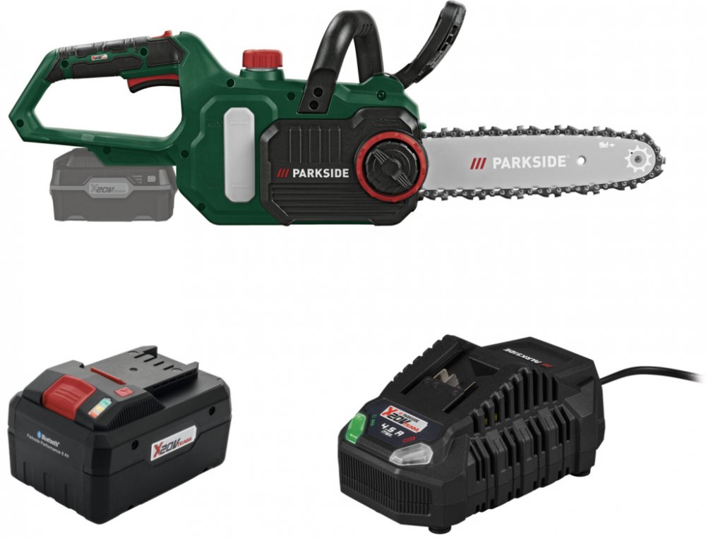 Parkside® Aku řetězová pila Paks 20-Li E5, Smart 8 Ah Parkside® Aku řetězová pila Paks 20-Li E5 Kompaktní; výkonná pila – ideální pro kácení a řezání až do cca 15 cm průměru Pohodlná práce díky pozvolnému rozběhu, brzdovému systému a okamžitému zastavení řetězu Rychlý postup řezání díky robustnímu pilovému řetězu s polovičním dlátem a roztečí 3/8″ Ergonomické držadlo s protiskluzovým měkkým povrchem a bezpečnostním spínačem Horní držadlo pro pohodlné řezání také v šikmém směru Brzda zpětného rázu „Anti-Kickback“ Beznástrojové napínání řetězu Automatický systém mazání řetězu Robustní drapákový doraz Kontrolní okénko stavu oleje a kryt nádržky na olej s pojistkou proti ztrátě Doporučený akumulátor: 20 V (4 Ah) Kompatibilní se všemi akumulátory série „X 20 V Team“ Dodané příslušenství: 1x ochranný kryt řetězu 180 ml bio řetězového oleje „Made in Germany“ Záruka: 3 roky Technické údaje Volnoběžné otáčky motoru: 26 000 min -1 Max. točivý moment motoru: 0,4 Nm Délka lišty: 12″ (cca 30,7 cm) Max. délka řezu: cca 23 cm Rychlost řetězu: max. 10 m/s Objem nádržky na olej: cca 270 ml Doba provozu: cca 20 min (2 Ah)/ cca 40 min (4 Ah) Rozměry cca 66,9 x 24,2 x 21,7 cm Hmotnost cca 3,3 kg ¨ Parkside Performance® Smart akumulátor 8 Ah Paps 208 A1 Li-Ion akumulátor v nové; výkonné dimenzi díky inteligentní technologii akumulátoru a použití článků typu 21700 Data akumulátoru a výkonnostní parametry lze konfigurovat prostřednictvím aplikace Parkside přes Bluetooth ® Nastavitelné režimy: výkon; vyvážený; ekologický a expert Monitorování akumulátoru – vyvolání dat o stavu nabíjení; zbývajícím času, době nabíjení; celkové době použití apod. Cell Balancing – delší doba provozu akumulátoru; zvýšená životnost akumulátoru Delší doba provozu a životnost akumulátoru díky rovnoměrně namáhaným článkům Maximální využití potenciálu nabití Ideální v kombinaci s inteligentní nabíječkou akumulátoru Parkside 20 V / 12 A Plgs 2012 A1 Kompatibilní se všemi výrobky série „Parkside X 20 V Team“ V porovnání s akumulátorem Parkside 20 V / 4 Ah PAP 20 B3: Delší doba provozu při stejné velikosti akumulátoru (rozměry) o 100 % Vyšší vybíjecí proudy pro větší výkon o 70 % Ovládání a vyvolání dat prostřednictvím aplikace Parkside Kompaktní konstrukce při vysoké hustotě výkonu díky použití článků typu 21700 Lze ovládat přes Bluetooth ® Záruka: 3 roky Z logistických důvodů zasíláme tento akumulátor pouze na doručovací adresu. Doručení není možné do Parcelshopu nebo Parcelboxu. Případné vrácení je možné jen přes síť prodejen Lidl. Technické údaje Typ: Li-Ion Jmenovité napětí: 20 V Kapacita: 8 Ah Ukazatel stavu nabití: 3stupňový Monitorování akumulátoru: prostřednictvím aplikace Parkside Rozměry cca 12,3 x 7,2 x 8,4 cm Hmotnost cca 1 kg Parkside® Rychlonabíječka PLG 20 C3 Vlastnosti Kompatibilní se všemi akumulátory řady Parkside X 20 V Team Automatické vypnutí nabíjení a LED ukazatel nabití Spodní strana s protiskluzovými nopky Integrovaný nástěnný držák Záruka: 3 roky Charakteristika produktu table{width:100%;}td{padding-right: 30px; padding: 0.5rem; border-bottom: 0.0625rem solid #e3e4e5;} tr:nth-child(odd) {background-color: #F2F2F3;} Jmenovitý příkon 120 W Nabíjecí proud max. 4,5 A Doba nabíjení při 20 V / 2 Ah: 35 minut při 20 V / 4 Ah: 60 minut při 20 V / 8 Ah: 120 minut při 20 V / 12 Ah: 180 minut Délka síťového kabelu cca 1,5 m Materiál plast Rozměry cca 15,0 x 9,2 x 7,1 cm Hmotnost cca 395 g