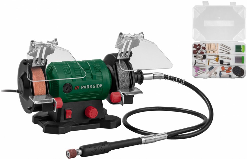 Parkside® Dvoukotoučová bruska s ohebnou hřídelí Pdfw 120 B3 Slouží k broušení; dělení; leštění a čištění Vhodná na ocel, barevné kovy, dřevo, plast a lakované povrchy 2 předmontované kotouče s průměrem 75 mm a šířkou 20 mm 1 brusný kotouč, 1 lešticí kotouč í hřídel na přesné práce Plynule nastavitelné otáčky Nastavitelná ochrana proti jiskrám Průhledný ochranný kryt Protiskluzové gumové nožky Zák...
