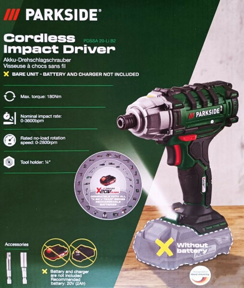 PARKSIDE® Aku rázový utahovák PDSSA 20-Li B2 Bez akumulátoru – bez nabíječky Slouží k šroubování a uvolňování šroubů, jakož i utahování a uvolňování matic Automatický příklepový mechanismus s vysokým výkonem Na kovové šrouby do M8 a šrouby do dřeva do Ø 8 mm Plynule nastavitelné otáčky Šestihranné uchycení nástroje s rychlouzávěrem Integrované pracovní LED svítidlo Praktický klips na opasek Držadlo a tělo s protiskluzovým, měkkým povrchem Pravý / levý chod Magnetický držák bitů po obou stranách Praktický kufřík na uložení Přístroj je kompatibilní se všemi akumulátory série „X 20 V Team" Doporučený akumulátor: 20 V (2 Ah) Akumulátor a nabíječka nejsou součástí balení Technické údaje Max. točivý moment: 180 Nm Počet úderů: 0–3 600 min⁻¹ Otáčky naprázdno: 0–2 800 min⁻¹ Uchycení nástrojů: ¼" Dodané příslušenství: čtyřhranný adaptér ¼", prodloužení bitů 50 mm Rozměry cca 18,9 x 19,2 x 9,3 cm Hmotnost cca 1,22 kg