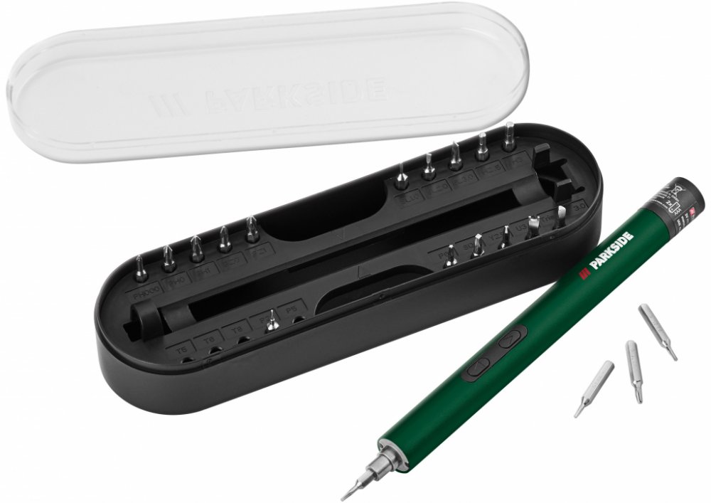 Parkside® Elektrický přesný šroubovák Peps 3 A1 Integrované pracovní LED světlo 2 tlačítka pro snadné přepnutí elektrického otáčení doleva nebo doprava Magnetický držák nástrojů Provoz na baterie – včetně 2x 1,5 V baterií AAA (již vložené a zajištěné) V praktickém úložném boxu s přehledným značením bitů Dodané příslušenství: 20 bitů, každý 4 mm Ph000, Ph0, Ph1, Pz0, Pz1, Sl1.0, Sl2.0, Sl3.0, T5, T6, T8, P2, P5, P6, H2,5, H3, Sq0, trojúhelník 3.0, Y2.5, U3.0 Technické údaje Dvojitý točivý moment: 0,2 Nm (elektrický) / 3 Nm (manuální) Max. otáčky: 160 min -1 Doba provozu: max. cca 200 min. Rozměry Šroubovák: cca Ø 1,6 x 17,4 cm Box: cca 19,8 x 5,7 x 4,2 cm Hmotnost Šroubovák: cca 70 g Box včetně příslušenství: cca 135 g Bity: cca 46 g