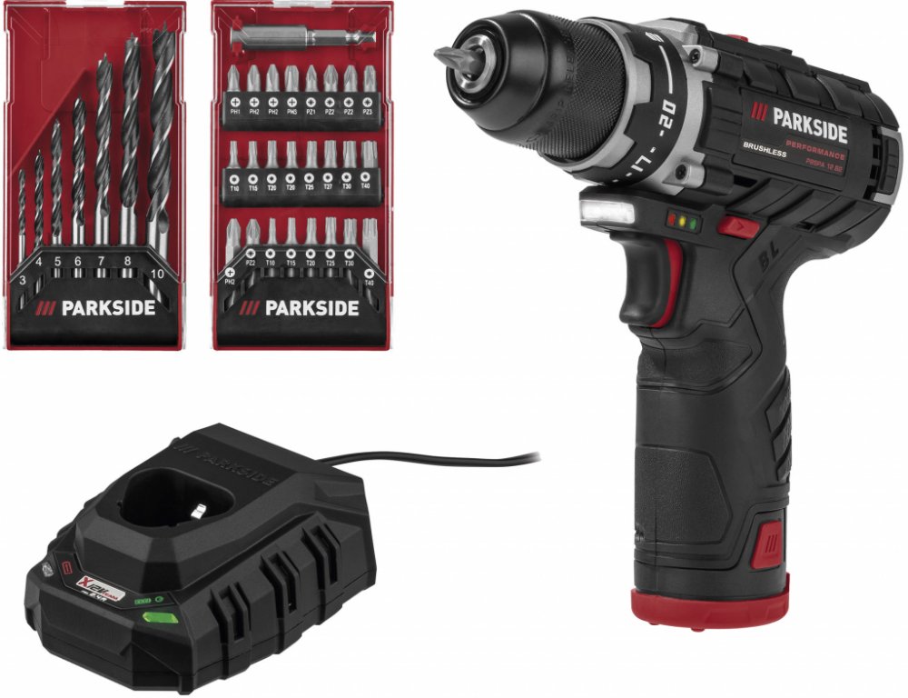 PARKSIDE PERFORMANCE Aku vrtací šroubovák s příslušenstvím PBSPA 12 B2 Bezkartáčový motor (brushless motor) – mimořádně vysoká životnost díky nízkému opotřebení Výkonný 12V Li-Ion akumulátor (2,0 Ah) Cell Balancing – delší doba provozu akumulátoru, zvýšená životnost akumulátoru: vyšší výkon akumulátoru díky rovnoměrně namáhaným článkům maximální využití potenciálu nabití 2,4A nabíječka s automatickým vypnutím nabíjení 3stupňový ukazatel stavu akumulátoru na výrobku Rychloupínací sklíčidlo z kovu 2stupňová převodovka s plynule nastavitelnými otáčkami a rychlým zastavením 20 předvolitelných stupňů točivého momentu a dodatečné nastavení vrtání Automatická aretace vřetena SPINDLE LOCK Integrované pracovní LED světlo Protiskluzové držadlo s měkkým povrchem Kompaktní konstrukce pro optimální použití Praktická taška – včetně 1 akumulátoru, 1 nabíječky a 32dílné sady příslušenství Kompatibilní se všemi akumulátory série „X 12 V Team“ Příslušenství: 7 vrtáků do dřeva, 25dílná sada bitů Technické údaje Baterie: 12V Li-Ion (2 Ah) Točivý moment: max. 35 Nm Otáčky: 1. stupeň 0–460 min-1 / 2. stupeň 0–1 750 min-1 Stupně točivého momentu: 20 + 1 vrtací stupeň Rozsah upínání vrtáku: 0,8–10 mm Průměr vrtáku: max. 19 mm do dřeva / 10 mm do oceli Materiál Sklolaminát, plast, ocel Rozměry cca 17 x 5,7 x 19 cm Hmotnost Aku vrtací šroubovák: cca 757 g Akumulátor: cca 188 g Nabíječka: cca 240 g