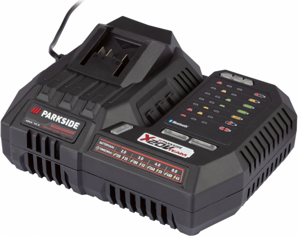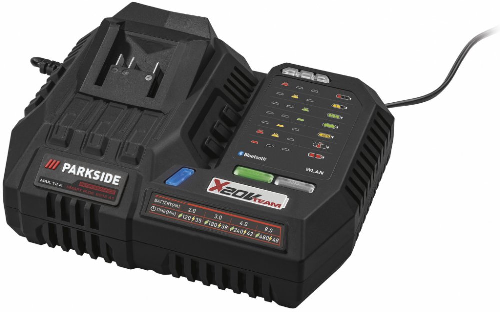 Inteligentní nabíječka baterií PARKSIDE PERFORMANCE® 20 V "PLGS 2012 A1VlastnostiVýkonná nabíječka baterií s technologií inteligentního nabíjení a ovládáním pomocí aplikaceVyvolávejte data, nechte si zasílat oznámení na mobilní telefon a nastavujte nabíjecí profily přes Wifi nebo přes Bluetooth® pomocí aplikace PARKSIDE5 volitelných nabíjecích profilů: Výkonný, Vyvážený, Ekologický režim, Expert a nabíjení proudem (60 %)Získávání dat z nabíječky: stav nabíjení, teplota a další parametryMonitorování baterie (s vloženou baterií): Načítání dat o stavu nabíjení, době nabíjení a push zprávě před dokončením nabíjení atdNa jednotce lze stisknutím tlačítka zvolit také režim Eco (nabíjení s nízkým nabíjecím proudem pro delší životnost baterie) a trickle charge (60 %)S automatickým vypnutím nabíjení a LED indikátorem nabíjeníVčetně zařízení pro montáž na stěnu (montážní materiál není součástí dodávky)Nabíjecí proud až 12 A (v závislosti na typu baterie)V porovnání s nabíječkou 20 V akumulátorů 4,5 A "PLG20 C3až o 266 % vyšší nabíjecí proudJednotka kompatibilní se všemi bateriemi řady PARKSIDE X 20 V TeamDodávka bez baterieOdpovídající baterii si můžete zde. Technické údajeJmenovitý příkon: 300 WNabíjecí proud: max. 12 ADoba nabíjení: 2 Ah - 35 min / 3 Ah - 38 min / 4 Ah - 42 min / 8 Ah - 48 min MateriálPlast RozměryNabíječka: cca 21,8 x 17,8 x 8,7 cmDélka síťového kabelu: cca 1,5 m Hmotnostcca 1 kg Všechna kompatibilní zařízení naší 20voltové řady najdete zde:
