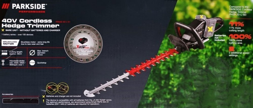 Parkside Performance® Aku nůžky na živý plot Ppahs 40 A1 – bez akumulátoru a nabíječky Vlastnosti Bezkartáčový motor Brushless Motor – mimořádně vysoká životnost díky nízkému opotřebení Výkonný přístroj se zadávacím a kontrolním polem: stupeň otáček a ukazatel stavu nabití akumulátoru 3stupňově nastavitelné otáčky pro optimální výsledky stříhání s malou námahou Laserovaný nůž s hliníkovou vodící l...