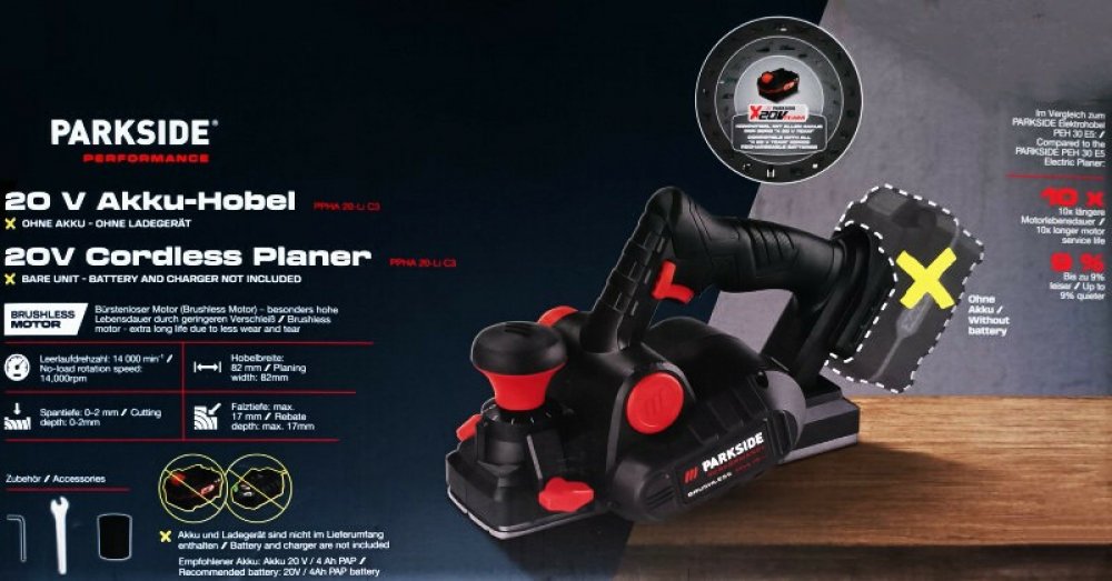Parkside Performance® Aku hoblík Ppha 20-Li C3 – bez akumulátoru a nabíječky Vlastnosti Bezkartáčový motor – mimořádně vysoká životnost díky nízkému opotřebení Výkonné a přesné hoblování s nastavitelnou hloubkou úběru Snadné frézování hran se třemi V drážkami Vyměnitelný oboustranný HSS hoblovací nůž Volitelná strana vyhazování hoblin vlevo nebo vpravo Připojení pro externí odsávání pilin včetně adaptéru Ergonomické držadlo s protiskluzovým měkkým povrchem Integrovaná přihrádka pro bezpečné uložení montážního nářadí Kompatibilní s běžnými hoblovacími noži V praktickém úložném kufříku Doporučený akumulátor: akumulátor 20 V / 4 Ah PAP Doporučená nabíječka: 12 A – PLG 20 C3 V porovnání s elektrickým hoblíkem Parkside PEH 30 E5: 10x delší životnost motoru Až o 9 % tišší Kompatibilní se všemi akumulátory série Parkside X 20 V Team Záruka: 5 let Charakteristika produktu tabletd Provozní režim: akumulátor Volnoběžné otáčky: 14 000 min -1 Napětí akumulátoru: 20 V Šířka hoblování: cca 82 mm Hloubka úběru: 0–2 mm Hloubka drážky: max. 17 mm Příslušenství: 2x HSS hoblovací nůž předmontovaný; 1x adaptér pro externí odsávání prachu, 1x inbusový klíč; 1x vidlicový klíč Materiál: plast; hliník Rozměry: cca 29 x 14,8 x 18,2 cm Hmotnost: cca 3,8 kg