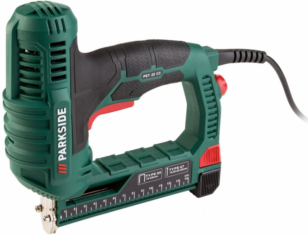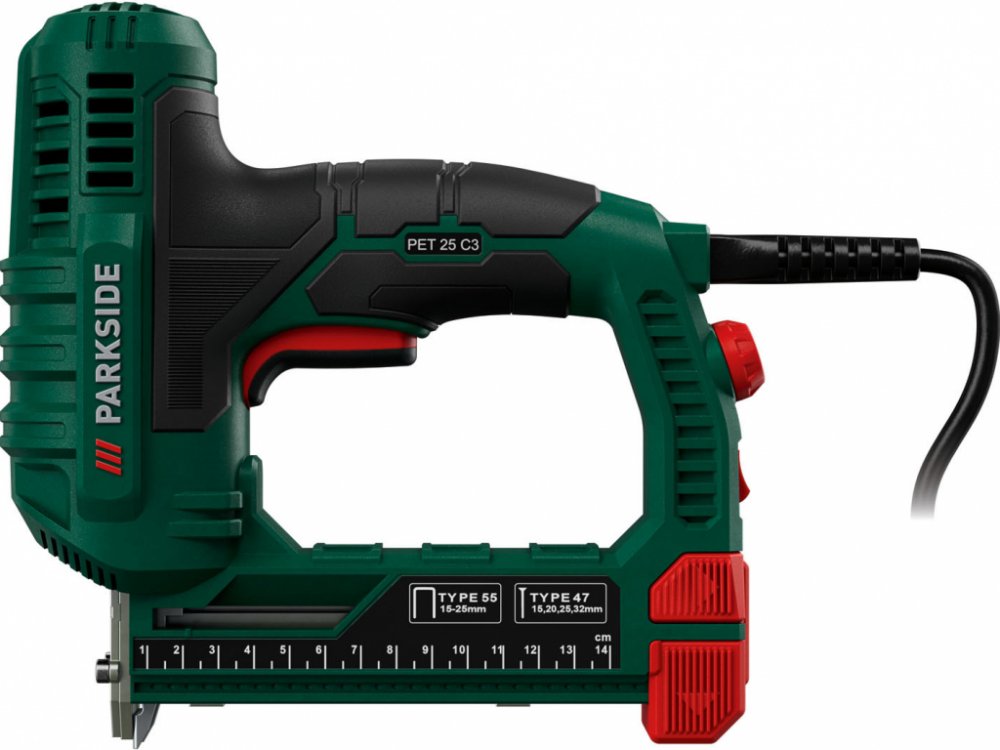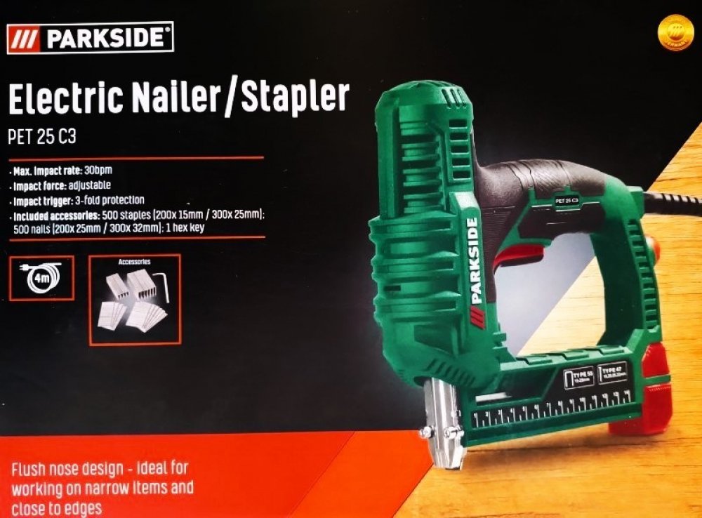 Pro kutily, do domácnosti nebo na umělecké práce Nastavovací kolečko pro plynulou předvolbu síly úderu Včetně zarážky pro paralelní hoblování Úzký nos sponkovačky pro drobné součástky a pro práci blízko okraje Praktický zadní nabíjecí systém s ukazatelem stavu Pro sponky 15–25 mm a hřebíky 15, 20, 25 a 32 mm Trojnásobně jištěná spoušť Technické údaje Max. počet úderů: 30 min⁻¹ Plynulé nastavení síly úderu Délka síťového kabelu: cca 4 m Obsah balení 500 sponek (200 po 15 mm / 300 po 25 mm) 500 hřebíků (200 po 25 mm / 300 po 32 mm) 1 imbusový klíč Rozměry cca 224 x 218 x 67 mm Hmotnost cca 1,659 kg