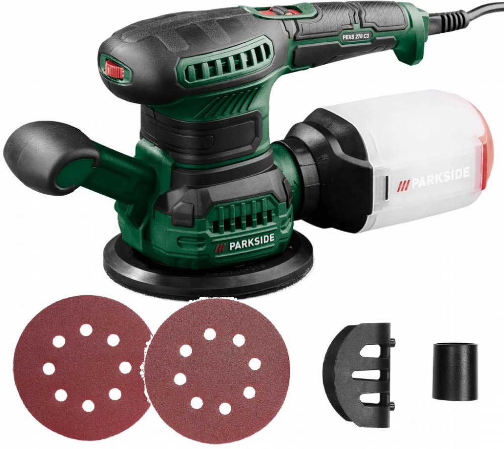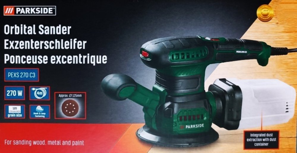 Plynule nastavitelný počet kmitů Integrovaná funkce odsávání se záchytnou nádobkou Vibrační bruska PSS 270 C3 Brusná plocha cca 92 x 182 mm – vhodná pro běžné brusné papíry (např. od Parkside) Upevnění brusného listu díky suchému zipu nebo beznástrojovému upínacímu systému Ergonomická měkká držadla – vhodná pro praváky i leváky Dodané příslušenství: adaptér pro externí odsávání prachu, 1 brusný list na suchý zip (zrnitost 120) Excentrická bruska PEXS 270 C3 Snadná výměna brusného listu díky suchému zipu Brusná plocha cca Ø 125 mm – vhodná pro běžné brusné papíry (např. od Parkside) Dodané příslušenství: adaptér pro externí odsávání prachu, 1 brusný list na suchý zip (zrnitost 120) Technické údaje Jmenovitý příkon: 270 W Počet kmitů naprázdno: 14 000–24 000 min⁻¹ AC motor, měděné vinutí Materiál Polyamid, skelné vlákno (PA6 + GF30) Rozměry Varianta vibrační bruska: cca 26,8 x 9,3 x 17,5 cm Varianta excentrická bruska: cca 28,7 x 12,2 x 16,6 cm Délka síťového kabelu: cca 4 m Hmotnost Varianta vibrační bruska: cca 1,82 kg Varianta excentrická bruska: cca 1,81 kg Záruka