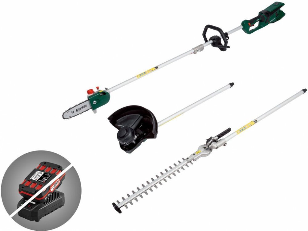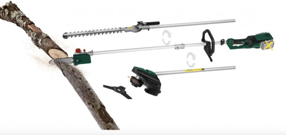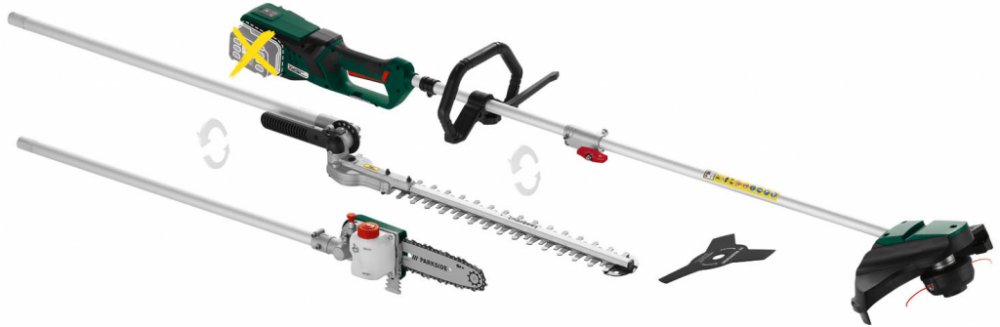 PARKSIDE® 4 v 1 zahradní bateriové kombinované nářadí 40 V PGKGA 40-Li B2- bez baterií, bez nabíječky- Vyžínač trávy - křovinořez - plotostřih - křovinořez- Flexibilní kombinovaný systém se 4 možnostmi použití:Vyžínač trávníku, křovinořez, plotostřih a nůžky na živé plotyKřovinořez- Jednoduchá výměna nástavců bez použití nářadí- Bezpečné stříhání stromů a živých plotů z úrovně země -Pracovní výška až cca 3,5 m- Pohodlné stříhání plevele a houštin- POHONNÁ JEDNOTKA- Inovativní bezkartáčový motor s vysokou energetickou účinností- Až o 30 % delší doba chodu ve srovnání s běžnými motoryKonvenčními motory- Bezkartáčová, bezúdržbová technologie motoru- Indikátor kapacity baterie na jednotce- Pohodlný popruh pro přenášení s rychloupínacím mechanismem- Ergonomická rukojeť s měkkou rukojetí a přídavným nastavenímPřídavná rukojeť s ochranou nohou- STŘIHAČ TRÁVY- Naviják s dvojitým závitem a automatickým chodem- Průměr sečení cca 30 cm- KŘOVINOŘEZ- Robustní 3zubý ocelový nůž- Průměr střihu cca 25 cm- ŘEZAČE RIP- Odolná kvalitní čepel z lasované speciální oceli- Beznástrojově nastavitelný pracovní úhel v 7 stupních odcca -45° až +90° / 1 odkládací poloha- Délka řezu cca 41 cm- Maximální tloušťka řezu cca 1,5 cm- HLAVNÍ PŘEDNOSTI- Vysoce kvalitní vodicí lišta a odolný řetěz- Automatický systém mazání řetězu- Nastavitelný pracovní úhel v 5 stupních (0°-90°)- Délka řezu: cca 18 cm Zahradní akumulátorové kombinované nářadí 40 V PGKGA 40-Li B2 - bez akumulátorů, bez nabíječky - Vyžínač trávy - křovinořez - plotostřih - křovinořez - Flexibilní kombinovaný systém se 4 možnostmi použití: vyžínač trávy, křovinořez, plotostřih a křovinořez - Snadná výměna nástavců bez použití nářadí - Bezpečné stříhání stromů a živých plotů ze země - Pracovní výška až do cca. 3,5 m - Pohodlné stříhání plevele a houštin - POHONNÁ JEDNOTKA - Inovativní bezkartáčový motor s vysokou energetickou účinností - Až o 30 % delší doba chodu ve srovnání s běžnými motory - Bezkartáčová, bezúdržbová technologie motoru - Ukazatel kapacity akumulátoru na jednotce - Pohodlný popruh pro přenášení s rychloupínacím zařízením - Ergonomická rukojeť s měkkým držadlem a nastavitelná přídavná rukojeť s ochranou nohou - TRÁVNÍKOVÁ STŘÍHAČKA - Dvouvláknová cívka s automatickým systémem inkrustace - Průměr střihu cca. 30 cm - VOLNÝ ŘEZ - Robustní třízubý ocelový nůž - Průměr řezu cca 25 cm - ZADNÍ ŘEZAČ - Odolný kvalitní nůž z lasované speciální oceli - Pracovní úhel nastavitelný bez použití nářadí v 7 stupních od cca 30 cm do cca 30 cm. -45° až +90° / 1 odkládací poloha - Délka řezu cca 41 cm - Maximální tloušťka řezu cca 1,5 cm - VYSOKÝ ŘETĚZ - Vysoce kvalitní čepel a odolný řetěz - Automatický systém mazání řetězu - 5stupňové nastavení pracovního úhlu (0°-90°) - Délka řezu: cca 18 cm
