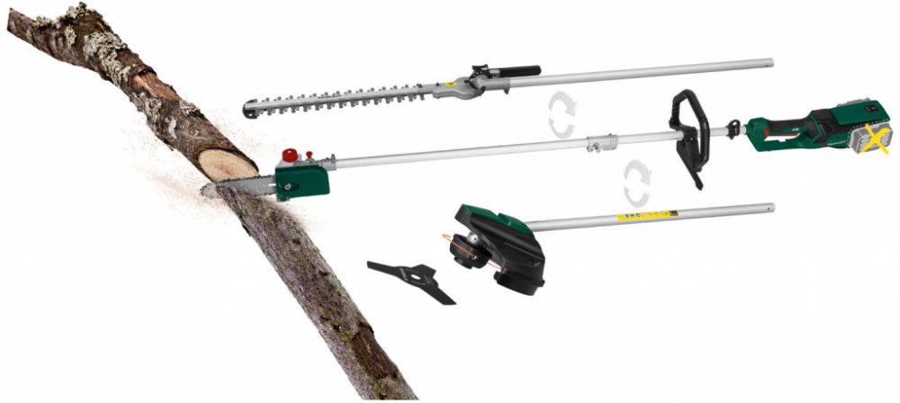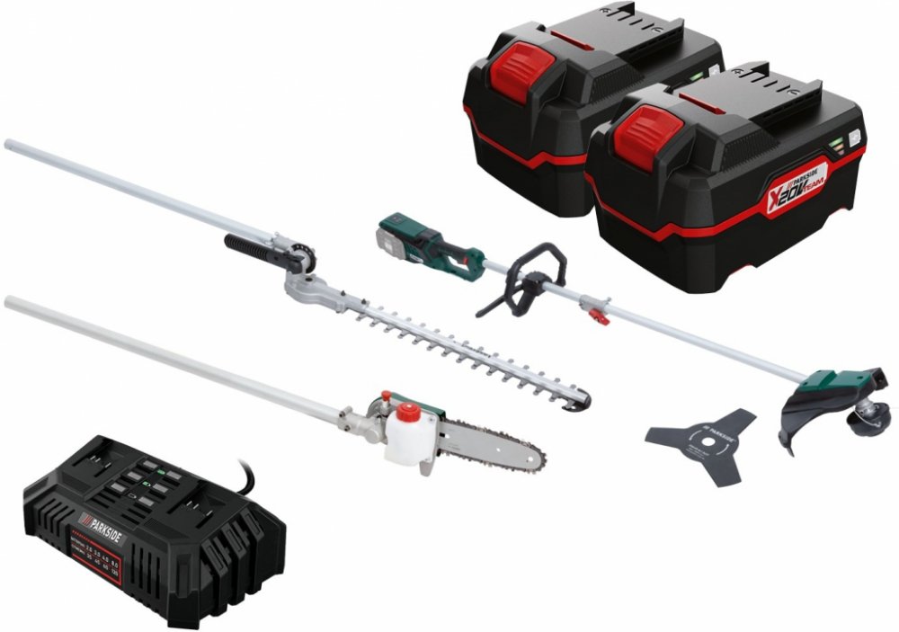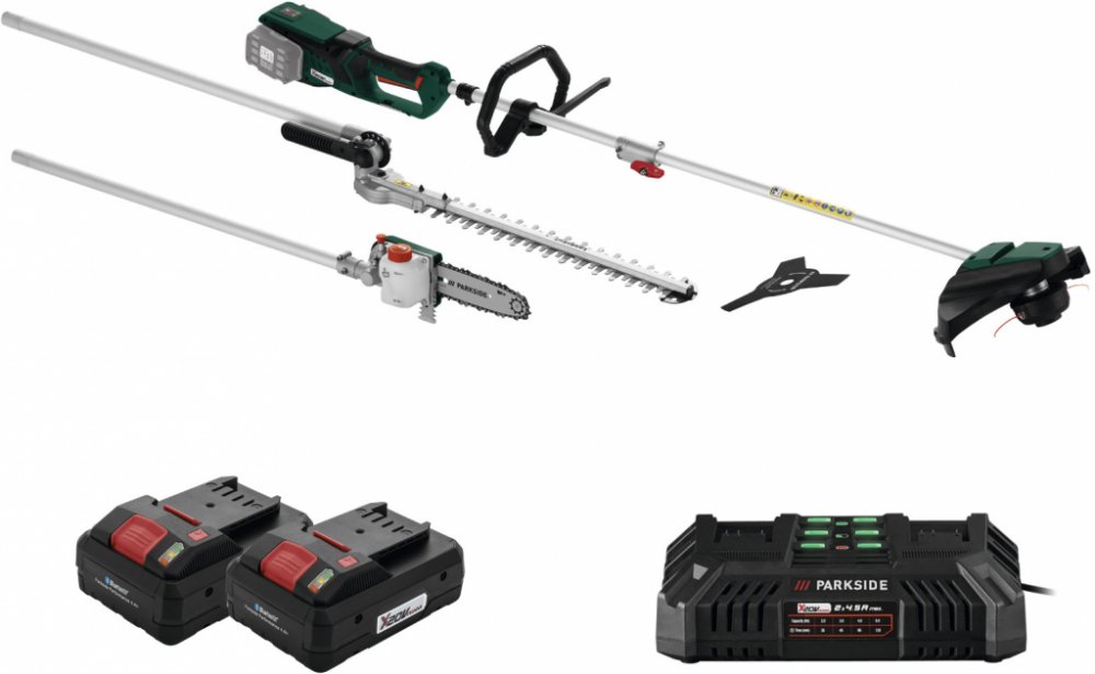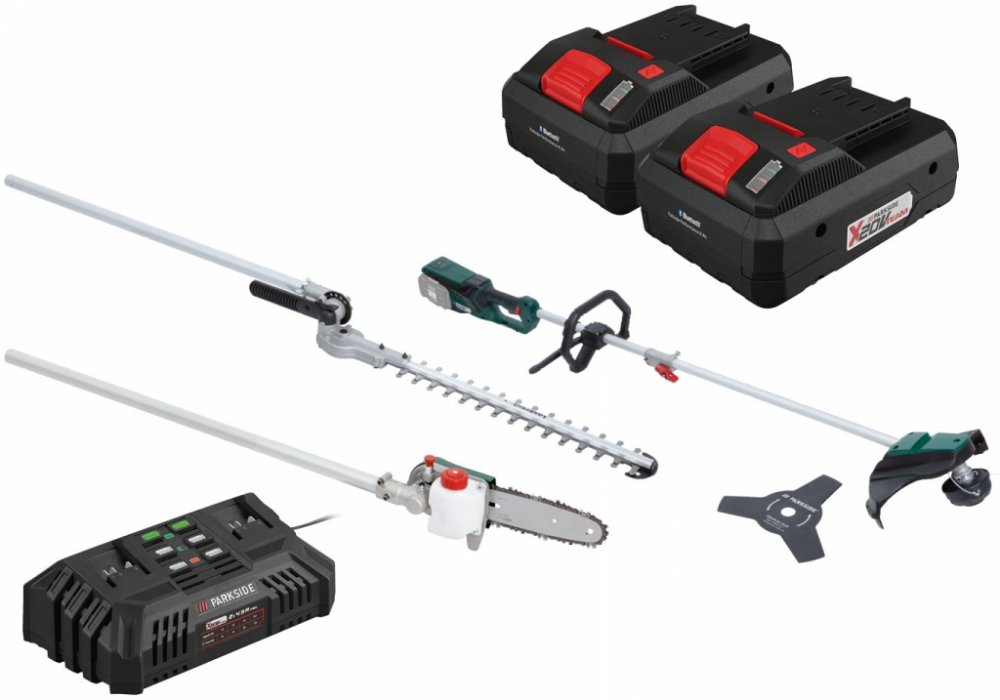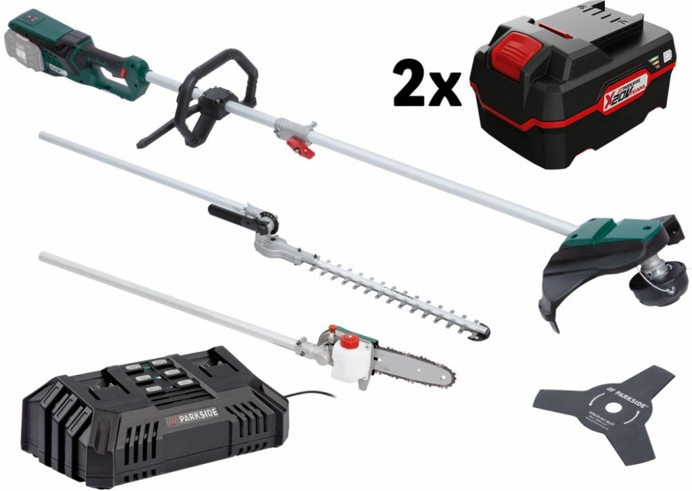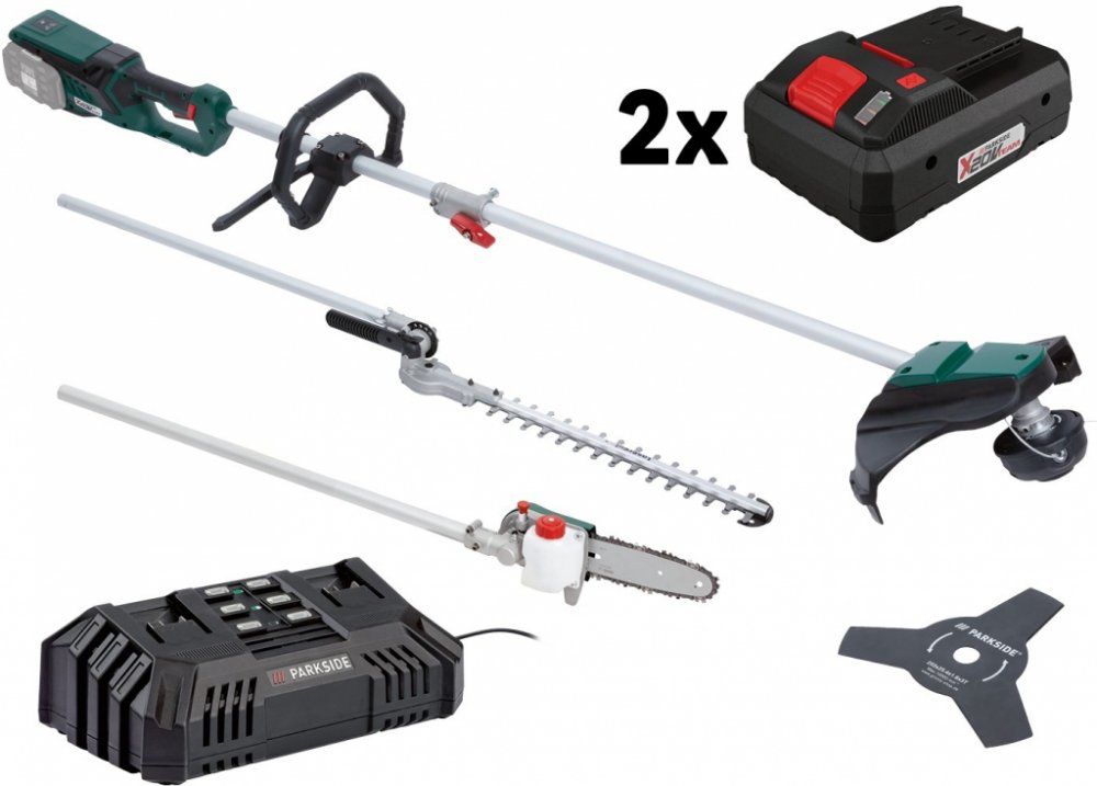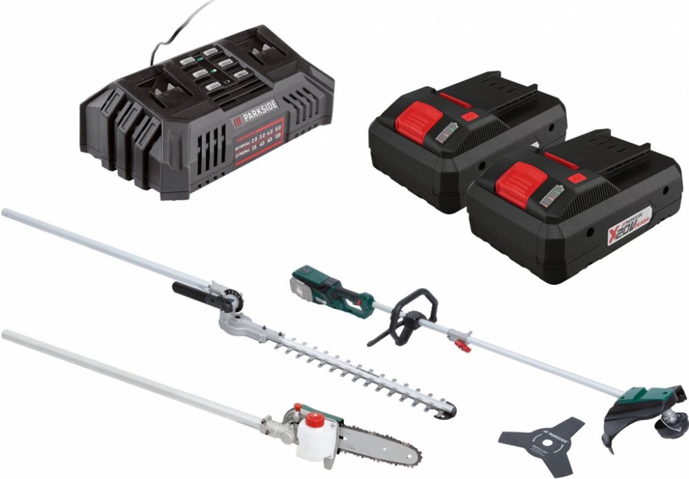 Parkside® Aku zahradní kombinované nářadí Pgkga 40-Li B2, 2x 4 Ah Parkside® Aku zahradní kombinované nářadí Pgkga 40-Li B2 Flexibilní kombinovaný systém pro 4 účely použití: vyžínač; křovinořez, nůžky na živý plot a odvětvovač Snadná výměna nástavce Bezpečná práce při řezání stromů nebo živého plotu díky pracovní výšce do cca 3,5 m Pohodlné sečení plevele a houštin Dodané příslušenství: 100 ml BIO řetězového oleje (Made in Germany), pohodlný nosný popruh, ochranný kryt nože a lišty; montážní nářadí Přístroj je kompatibilní se všemi akumulátory série „X 20 V Team" Pro provoz jsou bezpodmínečně potřebné 2 akumulátory Záruka: 3 roky Hnací jednotka Inovativní bezkartáčový motor s vysokou energetickou účinností: až o 30 % delší doba provozu v porovnání s běžnými motory bezkartáčová; bezúdržbová technologie motoru Ukazatel kapacity akumulátoru na výrobku Pohodlný nosný popruh s rychloupínacím zařízením Ergonomický měkký úchop Soft Grip a přídavné držadlo s chráničem nohou Vyžínač Dvojitá struna s automatickým odvíjením Průměr sečení: cca 30 cm Křovinořez Robustní třízubý ocelový nůž Průměr sečení: cca 25 cm Nůžky na živý plot Kvalitní nůž s dlouhou životností z laserované speciální oceli Pracovní úhel nastavitelný beznástrojově na 7 stupňů v rozsahu cca –45° až +90° / 1 úložná poloha Délka řezu: cca 41 cm Maximální tloušťka řezu: cca 1,5 cm Odvětvovač Kvalitní lišta a řetěz s dlouhou životností Automatický systém mazání řetězu Pracovní úhel nastavitelný na 5 stupňů (0°–90°) Délka řezu: cca 18 cm Rozměry Vyžínač (s nůžkami na živý plot): cca 235 x 34 x 20 cm Hmotnost Vyžínač (s nůžkami na živý plot): cca 4,47 kg Parkside® Akumulátor 4 Ah PAP 20 B3 Výkonný Li-Ion akumulátor se 3stupňovým ukazatelem stavu baterie Cell Balancing – delší doba provozu akumulátoru; zvýšená životnost akumulátoru Delší doba provozu a životnost akumulátoru díky rovnoměrně namáhaným článkům Maximální využití potenciálu nabití Kompatibilní se všemi nářadími série „Parkside X 20 V Team“ Záruka: 3 roky Technické údaje Typ: Li-Ion Napětí: 20 V Kapacita: 4 Ah Rozměry cca 12,6 x 7,1 x 8,4 cm Hmotnost cca 712 g Parkside® Dvojitá rychlonabíječka Pdslg 20 B1 Současné nabíjení 2 akumulátorů – také s různými kapacitami Automatické vypnutí nabíjení s 3stupňovým ukazatelem stavu nabití akumulátoru Protiskluzové gumové nopky Včetně zařízení pro upevnění na stěnu (montážní materiál není součástí balení) Kompatibilní se všemi akumulátory série „X 20 V Team“ Záruka: 3 roky Technické údaje Jmenovitý příkon: 220 W Max. nabíjecí proud: 2x 4,5 A Doba nabíjení (2 Ah / 4 Ah / 8 Ah): cca 35 min / cca 60 min / cca 120 min Rozměry cca 25 x 14,5 x 8,7 cm Délka síťového kabelu: cca 2 m Hmotnost cca 970 g