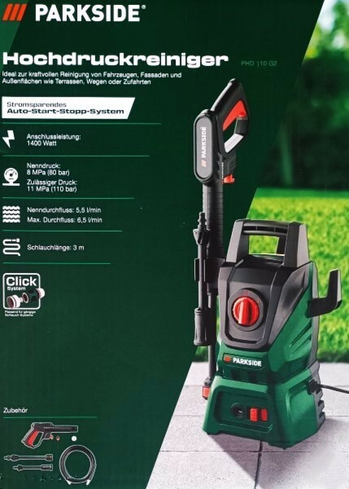 Parkside® Vysokotlaký čistič PHD 110 G2 Vlastnosti Ideální pro výkonné čištění vozidel, fasád a vnějších ploch jako jsou terasy, chodníky; příjezdové cesty apod. Individuálně nastavitelná standardní vario tryska s plynulým přechodem z bodového na plochý paprsek Energeticky úsporný systém automatického start-stop: Motor pracuje pouze při stisknutí pistolové rukojeti Ergonomická pistolová rukojeť včetně dětské pojistky Robustní plastové tělo odolné proti nárazu Čerpací systém s dlouhou životností vyrobený z korozivzdorného hliníku Flexibilně použitelný díky lehké konstrukci a ergonomickému držadlu Prodlužovací trubka pro zvýšení dosahu Vysokotlaká hadice s ochranou proti kroucení s rychlospojkou cca 3 m Rychlopřipojovací systém pro rychlou výměnu nástavce Nacvakávací systém Parkside®: vhodný pro běžné hadicové systémy Praktický držák na síťový kabel a příslušenství Dodané příslušenství: 1x pistolová rukojeť, 1x standardní vario tryska, 1x prodlužovací trubka, 1x hadicová rychlospojka, 1x jehla na čištění trysek, 1x vysokotlaká hadice (cca 3 m) Charakteristika produktu ;} Příkon: 1 400 W Síťové napětí: 220–240 V Napětí akumulátoru: - Sací výška: - Tlak: 8 MPa (80 bar) Průtok: max. 6,5 l/min (390 l/h) Délka síťového kabelu: cca 5 m Materiál: plast; nerezová ocel Rozměry: cca 26,5 x 23,0 x 39,0 cm (D x Š x V) Hmotnost: cca 3,7 kg