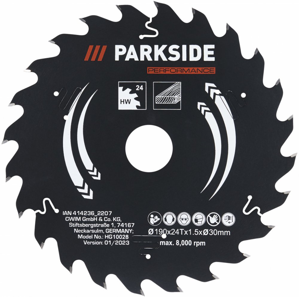PARKSIDE PERFORMANCE® Pilový kotouč pro okružní pily, 190 mm Kvalitní pilový kotouč z tvrdokovu s dlouhou životností Pro přesné řezy do dřeva a dřevěných materiálů Optimalizovaný pro aku nářadí Vhodný pro běžné kotoučové pily s vhodným průměrem a upnutím 30, 20 nebo 16 mm(např. PARKSIDE, Bosch, Black & Decker, Einhell, Makita, Metabo) Dodané příslušenství: 2x redukční kroužek (30 na 20 mm / 30 na 16 mm) V porovnání s běžným pilovým kotoučem Parkside PKSB 210 A1: O 50 % vyšší životnost O 30 % vyšší rychlost řezu O 30 % menší hlučnost Pilový kotouč 24 zubů PKSBP 19024 A1 Kotouč se 24 zuby (WZ) pro rychlé a výkonné řezy Pilový kotouč 48 zubů PKSBP 19048 A1 Kotouč se 48 zuby (WZ) pro univerzální použití Pilový kotouč 60 zubů PKSBP 19060 A1 Kotouč se 60 zuby (WZ) pro jemné řezy Technické údaje Otáčky: max. 8 000 min-1 Rozměry Průměr: 190 mm Šířka řezu: 1,5 mm Ø otvoru: 30 mm Hmotnost Pilový kotouč 24 zubů PKSBP 19024 A1: cca 205 g Pilový kotouč 48 zubů PKSBP 19048 A1: cca 210 g Pilový kotouč 60 zubů PKSBP 19060 A1: cca 213 g