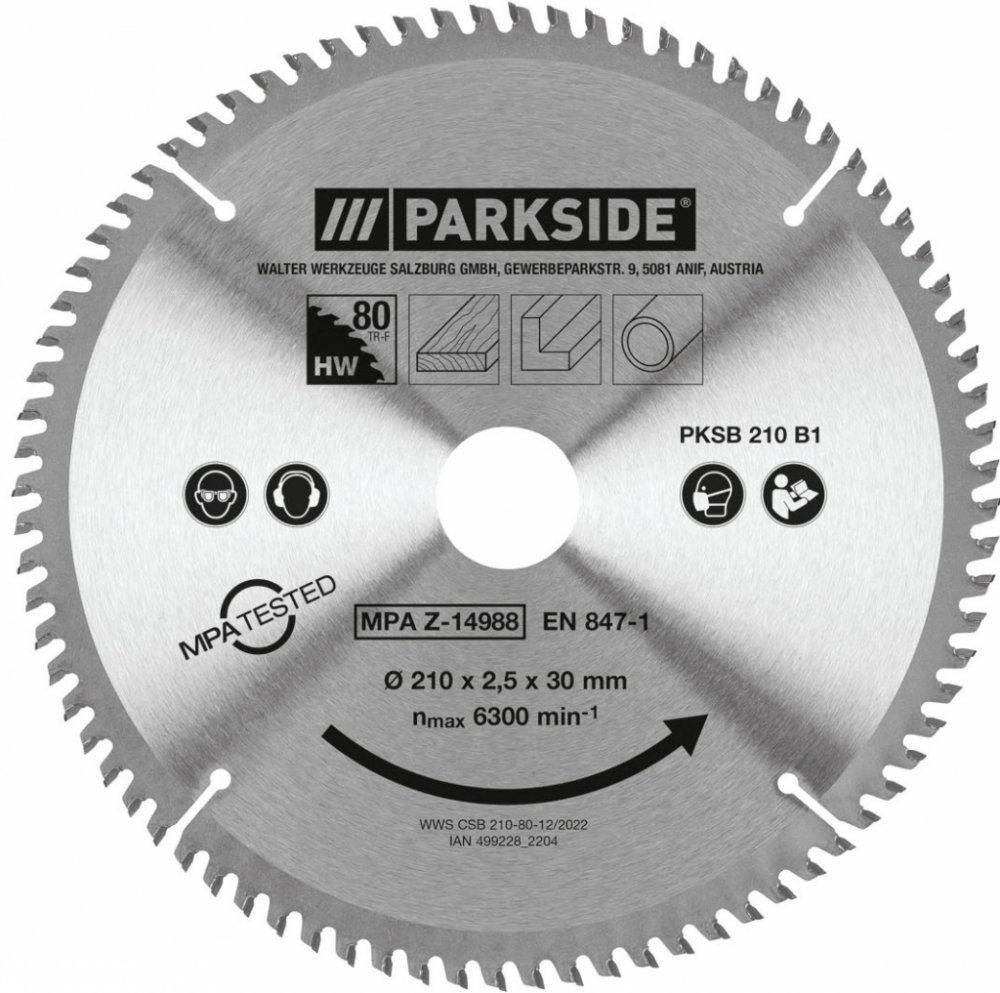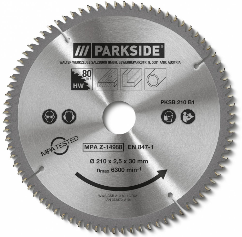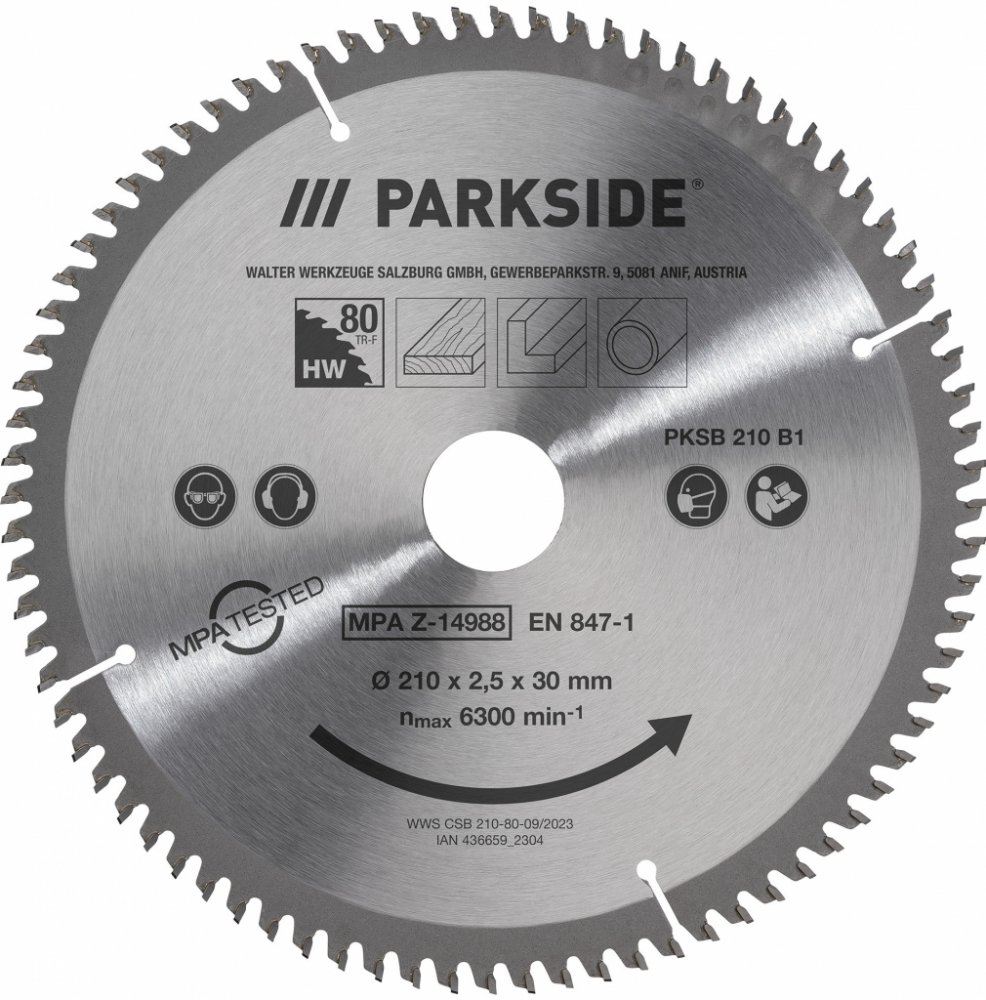 PARKSIDE Pilový kotouč PKSB 210 B1 Kvalitní pilový kotouč z tvrdokovu s dlouhou životností Pro kompozitní materiály, vrstvené dřevotřískové desky, plasty, barevné kovy a tvrdé dřevo Vhodný pro běžné kotoučové pily s vhodným průměrem a upnutím 30, 20 nebo 16 mm (např. Parkside, Bosch, Black & Decker, Einhell, Makita, Metabo) Dodané příslušenství: 2x redukční kroužek (20 a 16 mm) TRF pilový kotouč 42 zubů Pilový kotouč (TR-F) se 42 zuby pro rychlé a výkonné řezání TRF pilový kotouč 60 zubů Pilový kotouč (TR-F) se 60 zuby pro univerzální použití TRF pilový kotouč 80 zubů Pilový kotouč (TR-F) s 80 zuby pro jemné opracovávání Technické údaje Max. otáčky: 6 300 min⁻¹ Životnost (tvrdé dřevo): cca 250 m Rozměry Průměr: cca 210 mm Šířka řezu: 2,5 mm Ø otvoru: 30 mm Hmotnost TRF pilový kotouč, 42 zubů: cca 365 g TRF pilový kotouč, 60 zubů: cca 365 g TRF pilový kotouč, 80 zubů: cca 385 g
