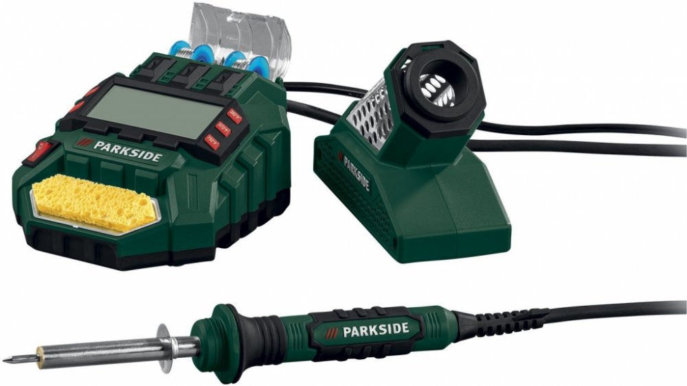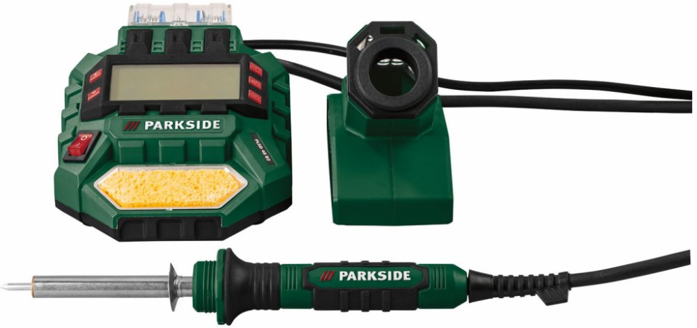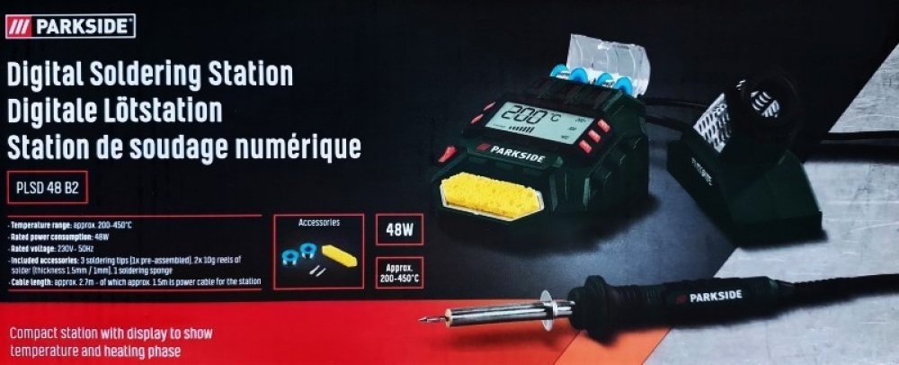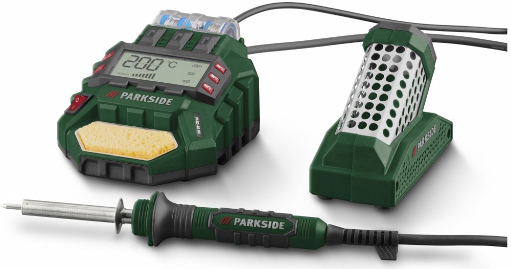 Parkside® Digitální pájecí stanice Plsd 48 B2 Univerzální použití v elektronice, modelářství a pro hobby Kompaktní stanice s kontrolním displejem pro teplotu a dobu ohřevu Ergonomické držadlo s protiskluzovým měkkým povrchem 3 vyměnitelné hroty Odkládací plocha s průhledným víkem pro pájecí cívky a pájecí hroty Nastavitelná teplota v rozsahu 200–450 °C – jemně nastavitelná v krocích po 10 3 tlačítka pro rychlou volbu 200 / 300 / 400 °C Samostatný držák páječky s uzavřenou ochrannou klecí Dodané příslušenství: 3 pájecí hroty (1x předmontovaný); 2 cívky pájky po 10 g (tloušťka 1,5 mm / 1,0 mm), 1 pájecí houba Technické údaje Teplotní rozsah: 200–450 °C Jmenovitý příkon: 48 W Jmenovité napětí: 230 V / 50 Hz Rozměry cca 16,6 x 12,8 x 8,1 cm Hmotnost cca 885 g