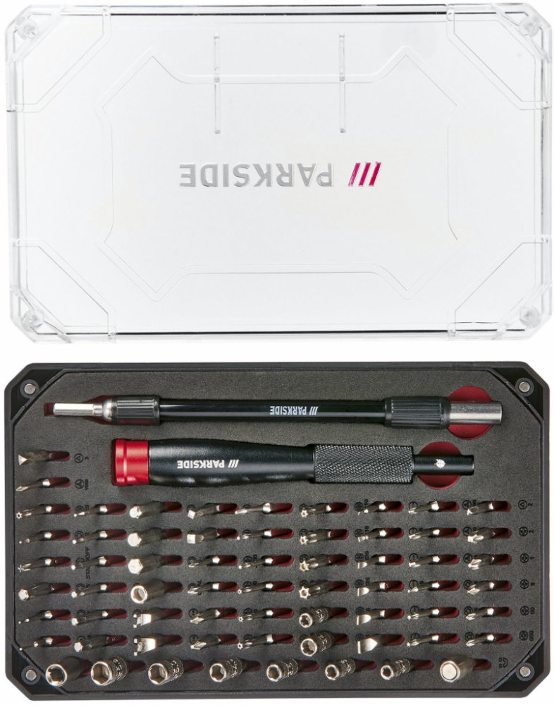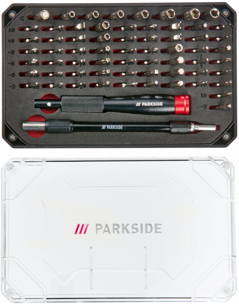 PARKSIDE® Sada nářadí pro jemnou mechaniku, 66dílná Praktický box s magnetickým uzávěrem Odnímatelné víko lze použít jako třídicí misku na šroubky a malé díly Obsah balení: 64x přesný bit: 5x křížová hlava: PH000, PH00, PH0, PH1, PH2 6x drážkovaný: SL0,2 x 1,0, SL0,3 x 1,5, SL0,4 x 2,0, SL0,4 x 2,5, SL0,5 x 3,0, SL0,8 x 4,0 4x torx T2, T3, T4, T5 8x torx (s otvorem): T6H, T7H, T8H, T9H, T10H, T15H...