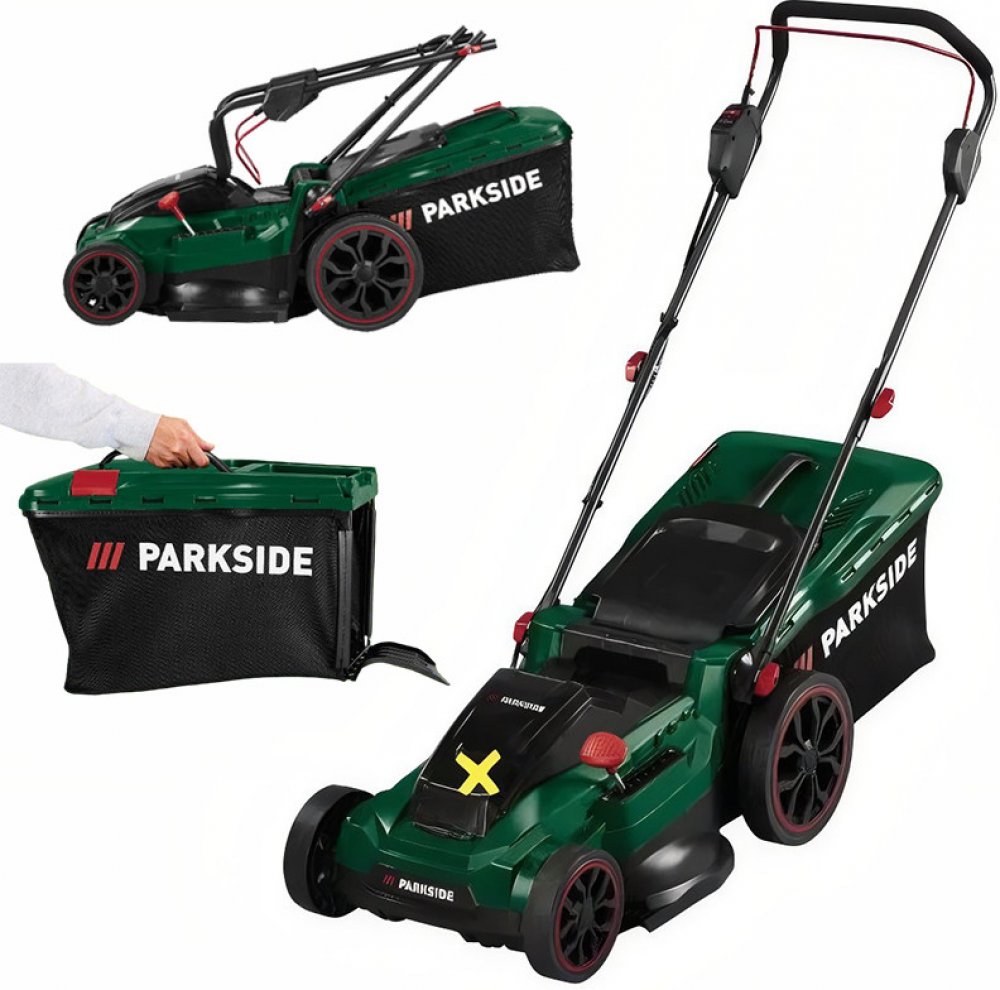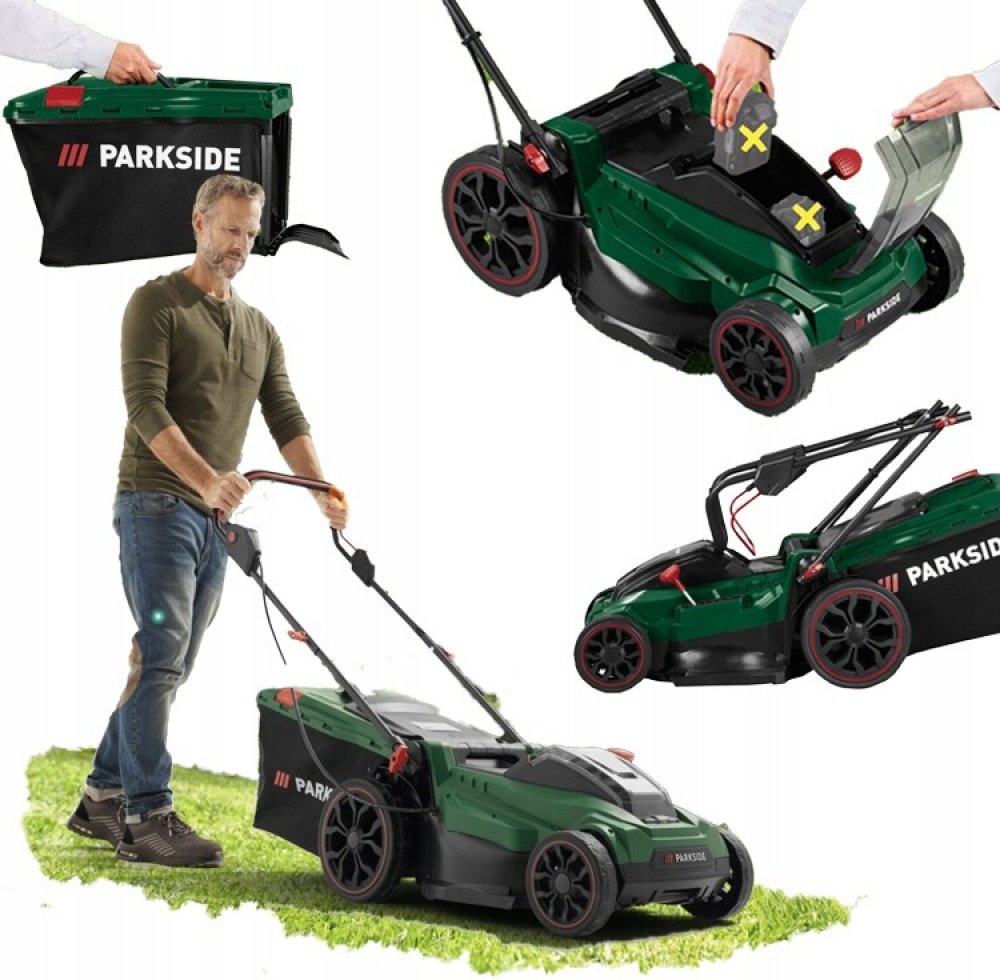 Parkside 900 W 40 cm plastové 12.7 kg akumulátorové 50 l 580 m2 900 W 40 V elektromotor 3300 ot/min 75 mm 3 s plastovo-látkovým košem