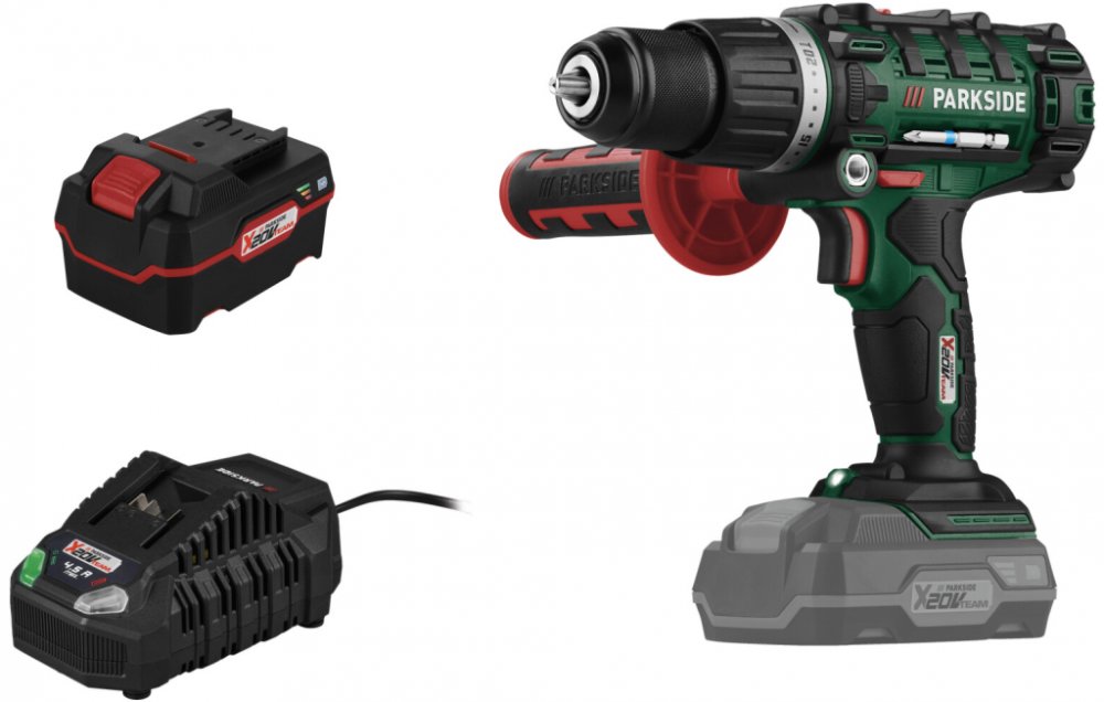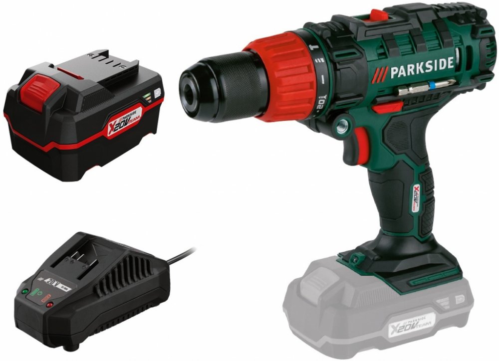 PARKSIDE® Aku příklepová vrtačka PSBSA 20-Li C3, 4 Ah Sada se skládá z aku příklepové vrtačky PSBSA 20-Li C3, akumulátoru 4 Ah PAP 20 B a nabíječky PLG 20 V A4 Kompatibilní s přístroji řady „PARKSIDE X 20 V Team“ Aku příklepová vrtačka PSBSA 20-Li C3 Výkonný motor s 2stupňovou převodovkou a vysoce výkonným příklepovým mechanismem Rychloupínací sklíčidlo z kovu s radiálním blokováním Vypínač s pl...