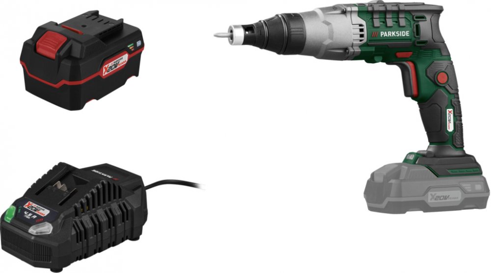 Parkside® Aku šroubovák na sádrokarton Ptbsa 20-Li A1, 4 Ah Parkside® Aku šroubovák na sádrokarton Ptbsa 20-Li A1 Rychlý a účinný – vhodný pro prvky suché výstavby jako sádrokartonové nebo polystyrenové desky Lze rozšířit zásobníkovým nástavcem Parkside PMA 55 A1 pro ještě vyšší účinnost Zásobníkový nástavec s beznástrojovou montáží Plynule nastavitelné otáčky s funkcí rychlého zastavení – včetně aretačního tlačítka Pohodlně nastavitelný hloubkový doraz pomocí nastavovacího pouzdra Integrované pracovní LED světlo Praktická spona na opasek včetně otvíráku na láhve V praktickém úložném kufříku Max. průměr šroubování: cca 4,2 mm Uchycení nástroje: ¼″ (vnitřní šestihran) Dodané příslušenství: 1 magnetický držák bitů, 1 šroubovací bit (Ph2) Kompatibilní se všemi akumulátory série „X 20 V Team“ Záruka: 3 roky Technické údaje Volnoběžné otáčky: 0–4 000 min⁻¹ Max. točivý moment: 15 Nm Rozměry cca 275 x 195 x 70 mm Hmotnost cca 1,115 kg Parkside® Akumulátor 4 Ah PAP 20 B3 Výkonný Li-Ion akumulátor se 3stupňovým ukazatelem stavu baterie Cell Balancing – delší doba provozu akumulátoru; zvýšená životnost akumulátoru Delší doba provozu a životnost akumulátoru díky rovnoměrně namáhaným článkům Maximální využití potenciálu nabití Kompatibilní se všemi nářadími série „Parkside X 20 V Team“ Záruka: 3 roky Technické údaje Typ: Li-Ion Napětí: 20 V Kapacita: 4 Ah Rozměry cca 12,6 x 7,1 x 8,4 cm Hmotnost cca 712 g Parkside® Rychlonabíječka PLG 20 C3 Automatické vypnutí nabíjení a LED ukazatelem nabití akumulátoru Protiskluzové gumové nopky Včetně zařízení pro upevnění na stěnu (montážní materiál není součástí balení) Kompatibilní se všemi akumulátory série „X 20V Team“ Záruka: 3 roky Technické údaje Jmenovitý příkon: 120 W Nabíjecí proud: 4,5 A Doba nabíjení (při 20 V / 2 Ah): cca 30 min (připraveno k použití) Doba nabíjení (při 20 V / 4 Ah): cca 60 min Doba nabíjení (při 20 V / 8 Ah): cca 120 min Rozměry cca 15,1 x 9,1 x 7,4 cm Délka síťového kabelu: cca 2 m Hmotnost cca 430 g