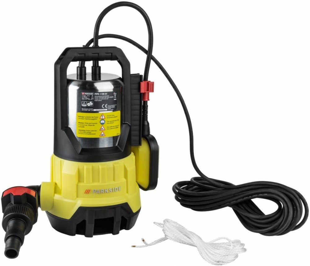 PARKSIDE® Ponorné čerpadlo PTPS 1100 A1 Ideální na odčerpání a přečerpání Kvalitní tělo z nerezové oceli s nerezavějící hřídelí 1100W motor s ochranou proti přetížení Individuálně nastavitelný plovákový spínač pro automatické zapnutí a vypnutí Úhlový adaptér pro připojení na zahradní hadici s 25 mm (1"), 32 mm (1¼") a 38 mm (1½") Rychlospojka pro úhlový adaptér Zařízení na uložení přívodního kabel...
