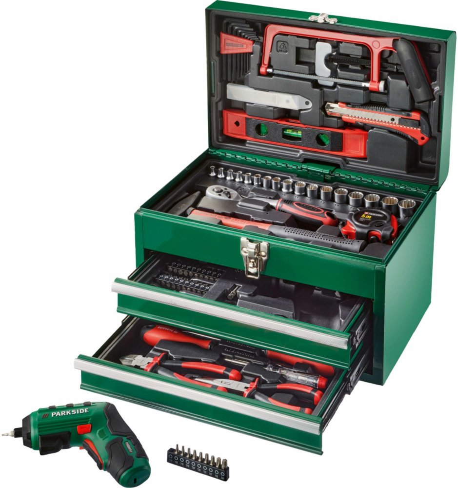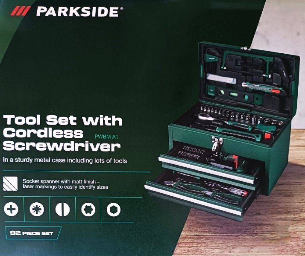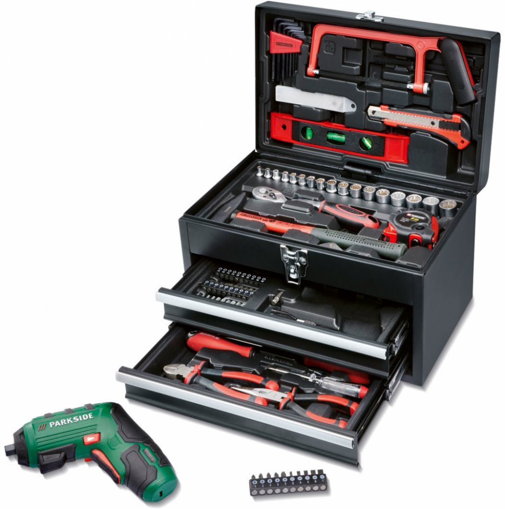 PARKSIDE® Kufr s nářadím a aku šroubovákem PWBM A1PopisRobustní kovový kufr s rozsáhlým vybavenímMatný nástrčný klíč – dobře rozeznatelné velikosti označené laserem92dílná sadaObsah balení: 1x akumulátorový šroubovák s Li-Ion akumulátorem 4 V (1,5 Ah)1x USB kabel typu C1x šroubovák s držákem bitů1x adaptér na bity40 bitů8x nástrčný klíč (6,3 mm)9x nástrčný klíč (10 mm)1x přepínací ráčna s 72 zuby1x pásmový metr, 5 m1x kladivo, 200 g1x adaptér pro nástrčné klíče1x klíč1x pila na kov, předmontovaná3x náhradní pilový list (2x na dřevo, 1x na kov)1x nůž5x náhradní čepel pro nůž1x vodováha8x Sechskantový klíč1x štípací kleště1x špičaté kleště1x zkoušečka napětí1x křížový šroubovák2x plochý šroubovák1x prodloužení Wobble: stupeň 1 – pracovní úhel do 10° a max. 162 Nm / stupeň 2 – pevné usazení vložek nástrčného klíče, max. 202 NmRozměrycca 35,5 x 23,5 x 29 cmHmotnostcca 8,95 kg