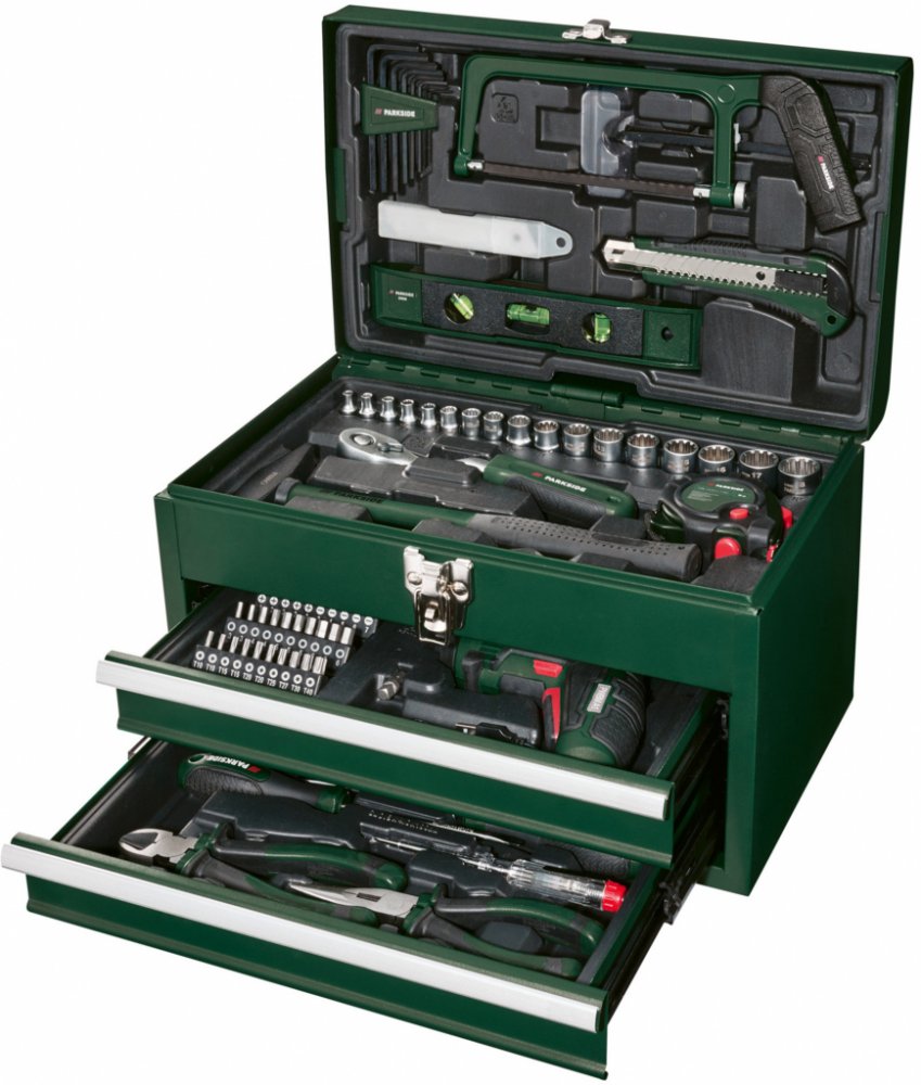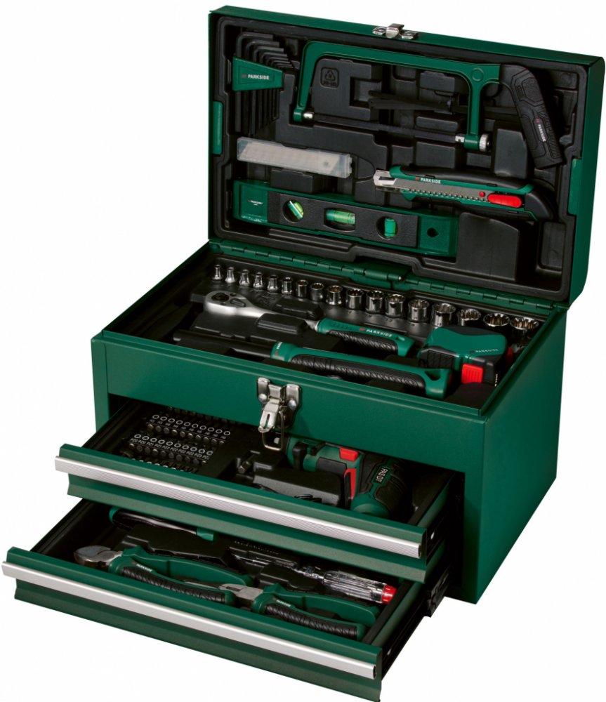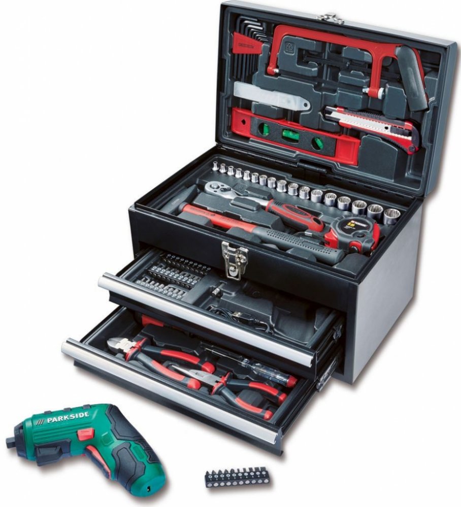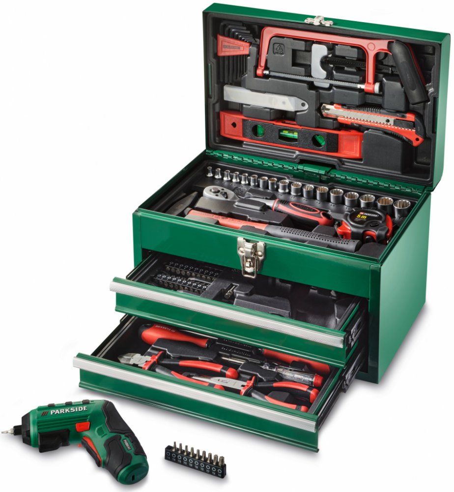 PARKSIDE® Kufr s nářadím a aku šroubovákem PWBM A1PopisRobustní kovový kufr s rozsáhlým vybavenímMatný nástrčný klíč – dobře rozeznatelné velikosti označené laserem92dílná sadaObsah balení: 1x akumulátorový šroubovák s Li-Ion akumulátorem 4 V (1,5 Ah)1x USB kabel typu C1x šroubovák s držákem bitů1x adaptér na bity40 bitů8x nástrčný klíč (6,3 mm)9x nástrčný klíč (10 mm)1x přepínací ráčna s 72 zuby1x pásmový metr, 5 m1x kladivo, 200 g1x adaptér pro nástrčné klíče1x klíč1x pila na kov, předmontovaná3x náhradní pilový list (2x na dřevo, 1x na kov)1x nůž5x náhradní čepel pro nůž1x vodováha8x Sechskantový klíč1x štípací kleště1x špičaté kleště1x zkoušečka napětí1x křížový šroubovák2x plochý šroubovák1x prodloužení Wobble: stupeň 1 – pracovní úhel do 10° a max. 162 Nm / stupeň 2 – pevné usazení vložek nástrčného klíče, max. 202 NmRozměrycca 35,5 x 23,5 x 29 cmHmotnostcca 8,95 kg