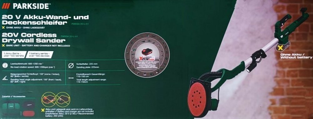 Akumulátorová bruska na stěny a stropy 20 V,PARKSIDE® PWDSA 20-Li A1,(bez akumulátoru a nabíječky)