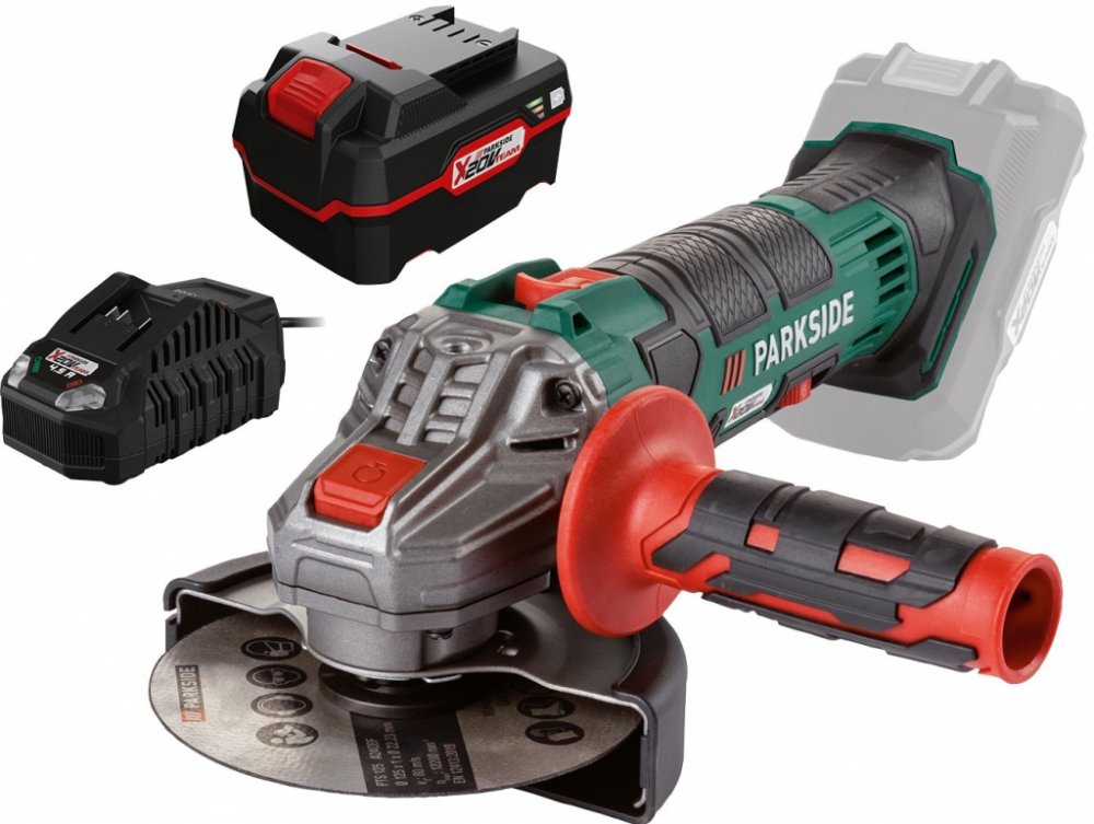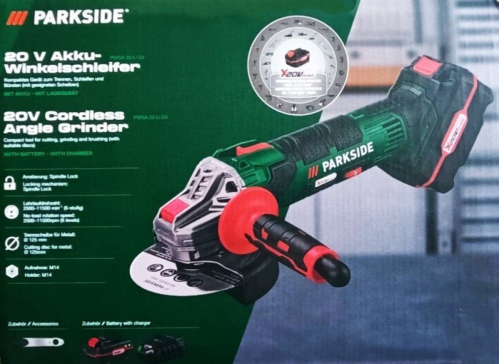 PARKSIDE® Aku úhlová bruska PWSA 20-Li D4, 4 Ah Kompatibilní se všemi přístroji série „PARKSIDE X 20 V Team“ Sada se skládá z aku úhlové brusky PWSA 20-Li D4, akumulátoru 4 Ah PAP 20 B3 a rychlonabíječky PLG 20 C3 Aku úhlová bruska PWSA 20-Li D4 Kompaktní zařízení na řezání, broušení a kartáčování Rukojeť Softgrip s protiskluzovým měkkým povrchem a robustním tělem převodovky z hliníkové slitiny ...