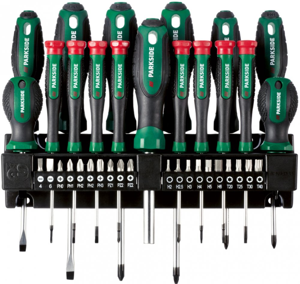 tabletd Parkside® Sada šroubováků a bitů, 37dílná Se sadou šroubováků Parkside® s nástěnným držákem získáte skvělé vybaveni pro práci v domácnosti nebo v dílně. Tato 37dílná sada nabízí komplexní výběr šroubováků a bitů, všechny s ergonomickými rukojeťmi a magnetickými hroty. Praktický nástěnný držák přitom udržuje vaše nářadí uspořádané a poskytuje rychlý přístup. Ať už montujete nábytek; opravujete elektrospotřebiče nebo jen potřebujete utáhnout šroub – tato sada vás nezklame a každou práci promění v radost. Vlastnosti Ergonomicky tvarované rukojeti pro pohodlnou práci Včetně nástěnného držáku s držákem bitů pro přehledné uložení Všechny šroubováky s magnetickou špičkou 37dílná sada Charakteristika produktu Barva: zelená; černá Detail: 37dílná sada; ergonomické rukojeti; magnetický hrot; včetně nástěnného držáku Materiál: plast; ocel Obsah balení: 3x křížový šroubovák: PH1 x 100 mm, PH2 x 38 mm, PH2 x 125 mm; 3x plochý šroubovák: SL 1,2 x 6,5 x 38 mm, SL 1,0 x 5,5 x 100 mm, SL 1,2 x 6,5 x 125 mm; 2x křížový šroubovák: PZ1 x 100 mm, PZ2 x 125 mm; 8x šroubovák pro jemnou mechaniku: SL 0,4 x 2,0 x 75 mm, SL 0,4 x 2,5 x 75 mm, SL 0,5 x 3,0 x 75 mm, Ph00 x 75 mm, PH0 x 75 mm, T6 x 75 mm, T8 x 75 mm, T10 x 75 mm; 20x bit 25 mm: 6x šestihran H2,0/H2,5/H3,0/H4,0/H5,0/H6,0, 4x Torx T20/T25/T30/T40, 2x plochý 4,0x0,8/6,0x1,0 mm, 5x Phillips PH0/PH1/2xPH2/PH3, 3x Pozidriv PZ1/2xPZ2; 1x magnetický držák bitů s rukojetí 75 mm; 1x nástěnný držák; 1x montážní příslušenství 4x šrouby a 4x hmoždinky