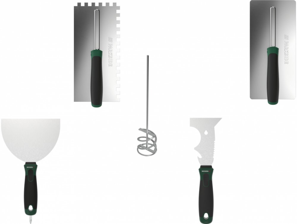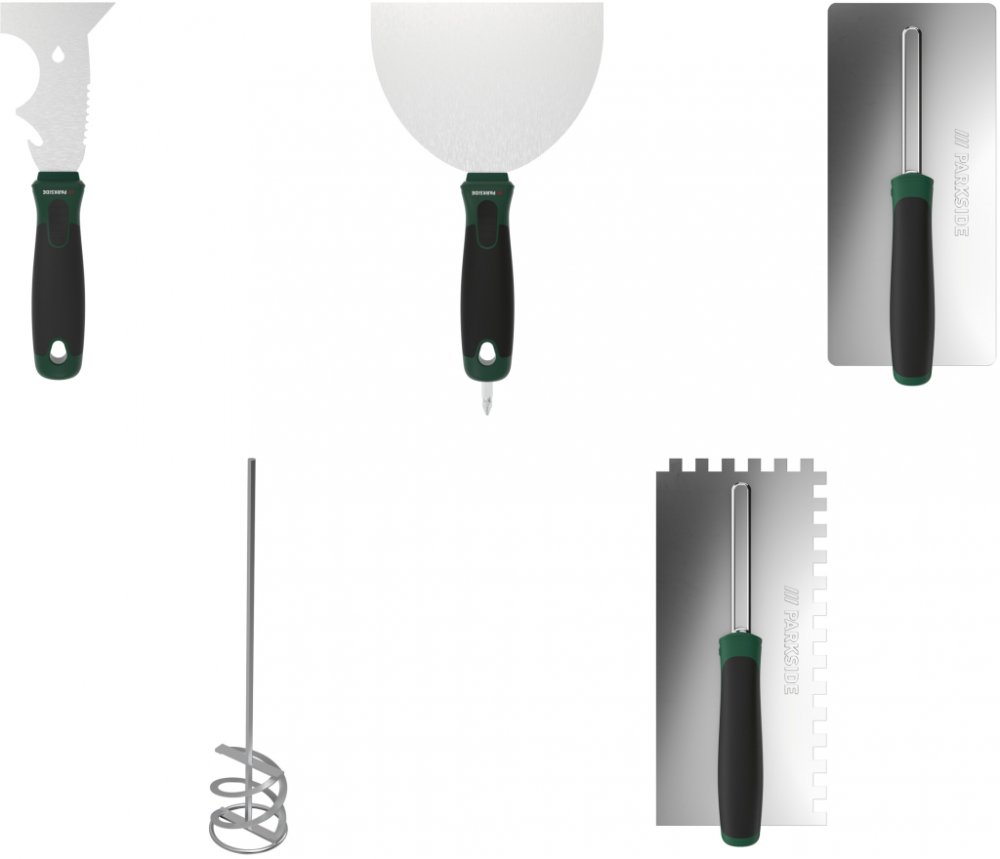 Parkside® Špachtle / Míchadlo / Stěrka Multifunkční špachtle Ergonomicky tvarovaná 2komponentní rukojeť Praktický otvor na zavěšení Nerezavějící Špachtle na sádrokarton Magnetický vyměnitelný bit 2komponentní měkká rukojeť Nerezavějící Zednická lžíce 2komponentní měkká rukojeť Zaoblené rohy Nerezavějící Míchadlo na barvu a omítku Na míchání množství do cca 20 kg 2komponentní měkká rukojeť Ozubená uhlazovací lžíce Nerezavějící Technické údaje Míchadlo na barvu a omítku Otáčky: max. 600 min -1 Materiál Míchadlo: pozinkovaná ocel Špachtle; lžíce: list: nerezová ocel Rozměry Multifunční špachtle: šířka čepele: cca 75 mm Špachtle na sádrokarton: cca 150 mm Zednická lžíce se zaoblenými rohy: cca 280 x 130 mm Míchadlo na barvu a omítku: Průměr spirály: cca 100 mm Šestihranná stopka: 8 mm Ozubená uhlazovací lžíce: cca 280 x 130 mm Hmotnost Multifunční špachtle: šířka čepele: cca 181 g Špachtle na sádrokarton: cca 177 g Zednická lžíce se zaoblenými rohy: cca 340 g Míchadlo na barvu a omítku: cca 380 g Ozubená uhlazovací lžíce: cca 330 g